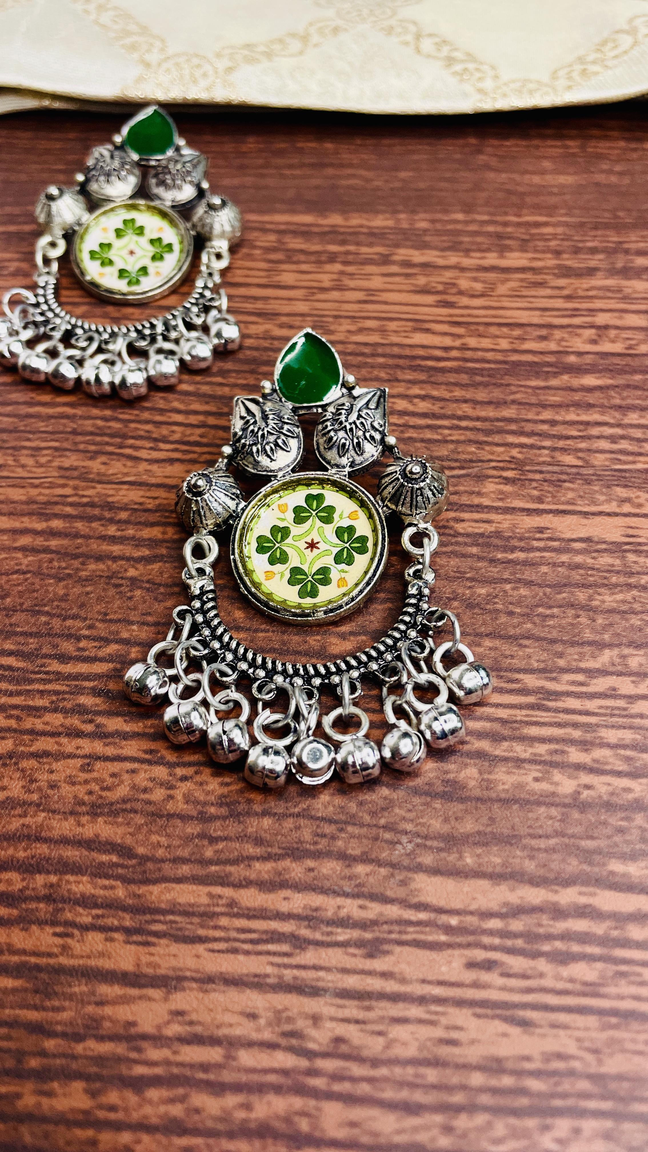 Make an unforgettable style statement with our Charvi Oxidised Dangler Earrings. Crafted in dark-polish oxidised finish, these earrings beautifully blend traditional artistry with modern flair. The intricate floral motif paired with green stone detailing and tiny ghungroo drops adds an ethnic charm that complements both festive and everyday looks. Perfect for sarees, kurtas, or fusion wear, Charvi brings out your inner elegance effortlessly.