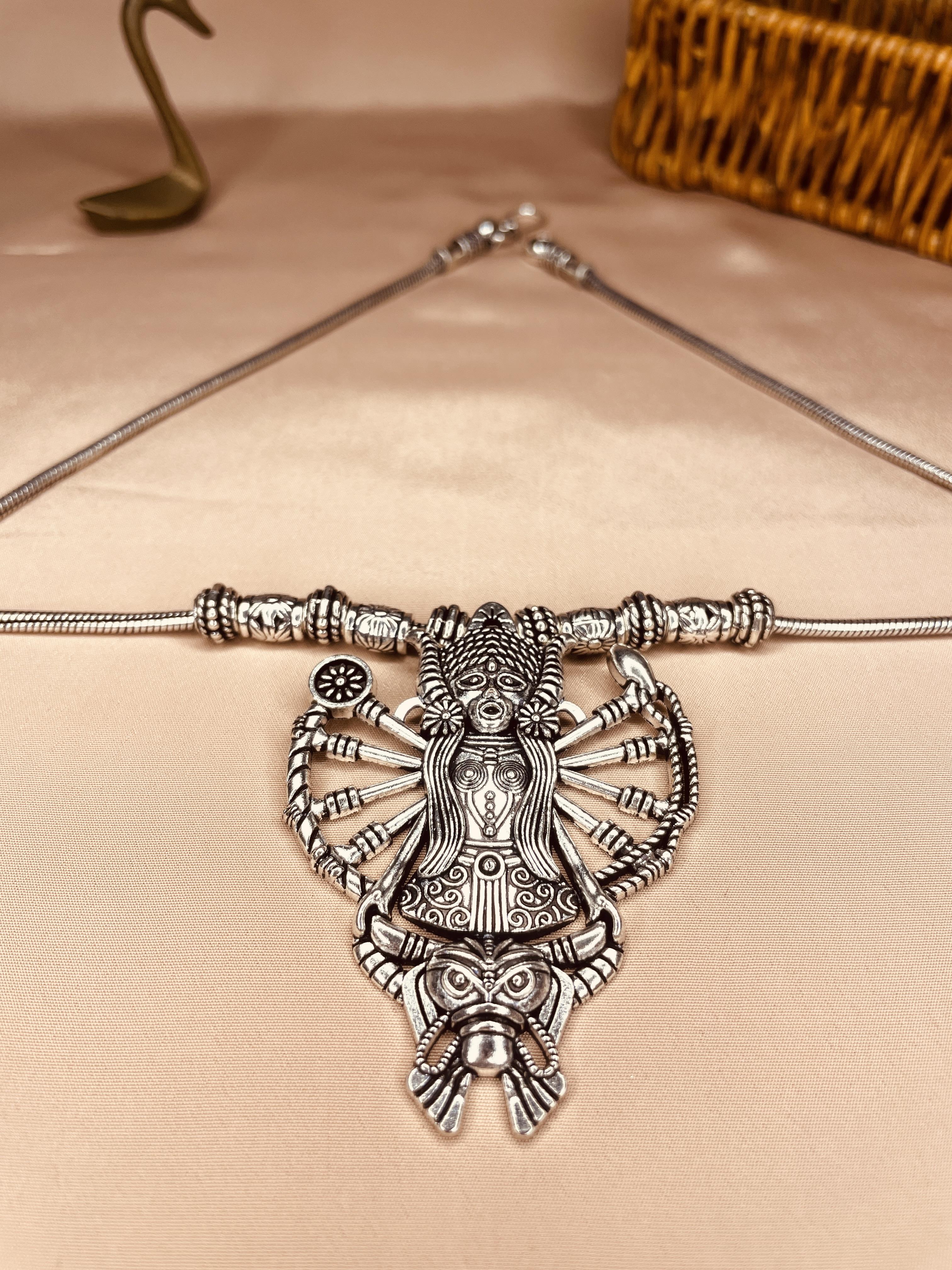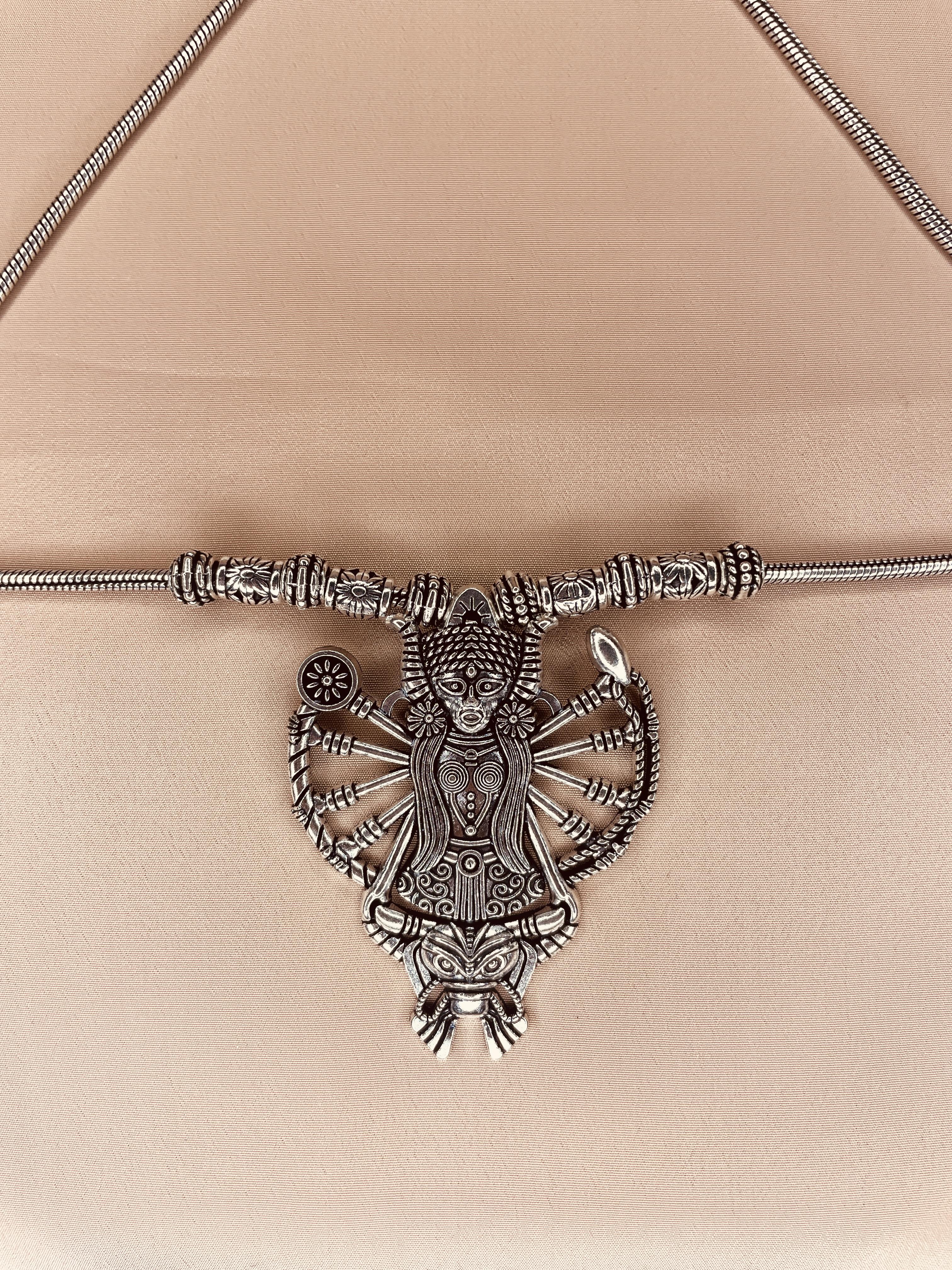 Embrace divine elegance with our Oxidised Aadi Shakti Chain Pendant, a masterpiece of spiritual artistry. This exquisite pendant features an intricately designed Aadi Shakti motif, crafted from oxidized silver with detailed embellishments, paired with a flexible chain for all-day comfort. Perfect for adding a sacred and stylish touch to your ensemble, it’s ideal for both devotional and fashionable occasions.