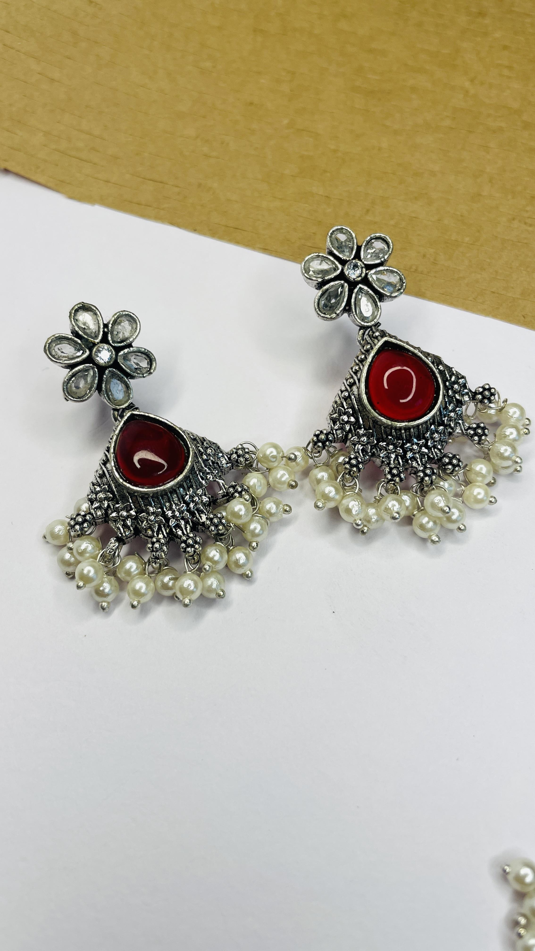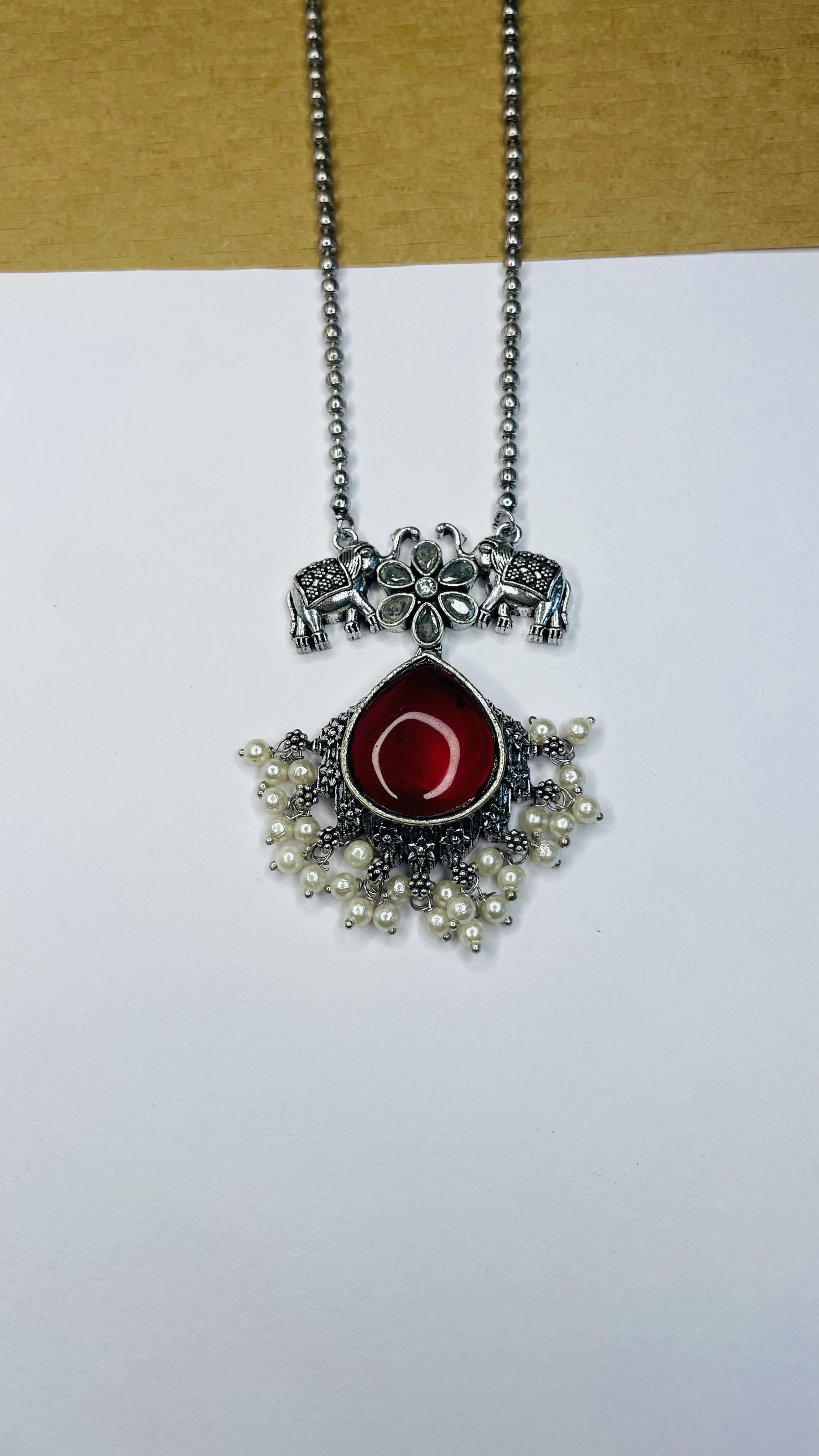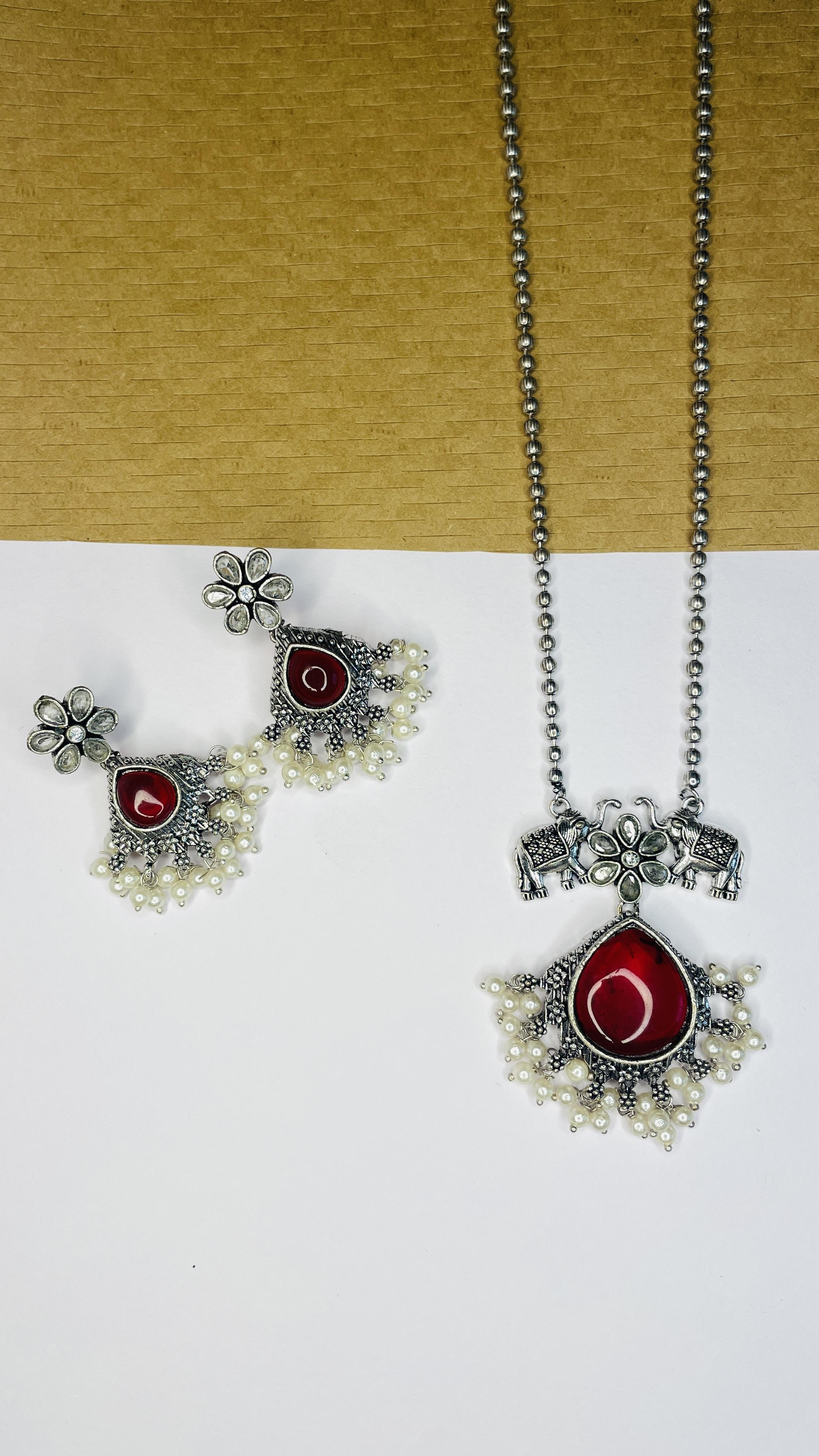 Discover the perfect fusion of cultural charm and vintage elegance with the Aaravi Oxidised Elephant Charm Necklace Set. This intricately crafted jewellery set features a bold red stone centerpiece surrounded by antique floral patterns and traditional elephant motifs, symbolizing strength and grace. The delicate pearl danglings and oxidised silver finish add a timeless touch, making it an ideal choice for festive occasions, ethnic wear, and statement styling.
