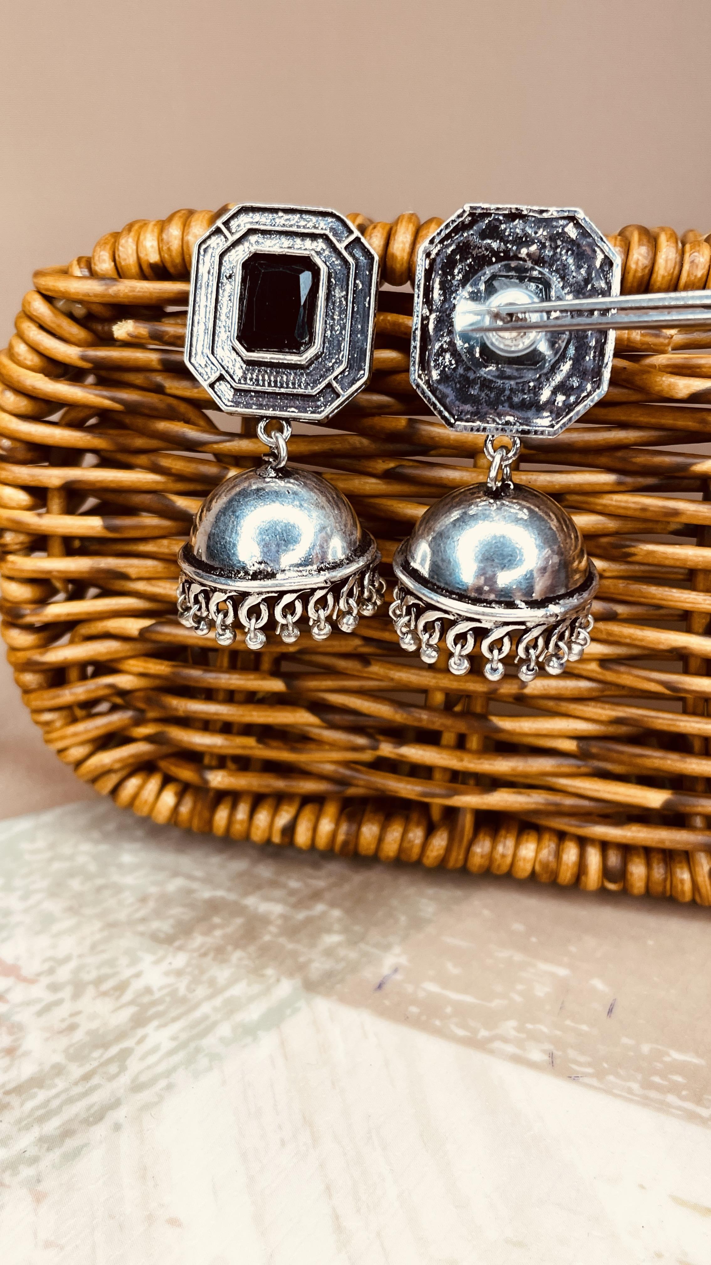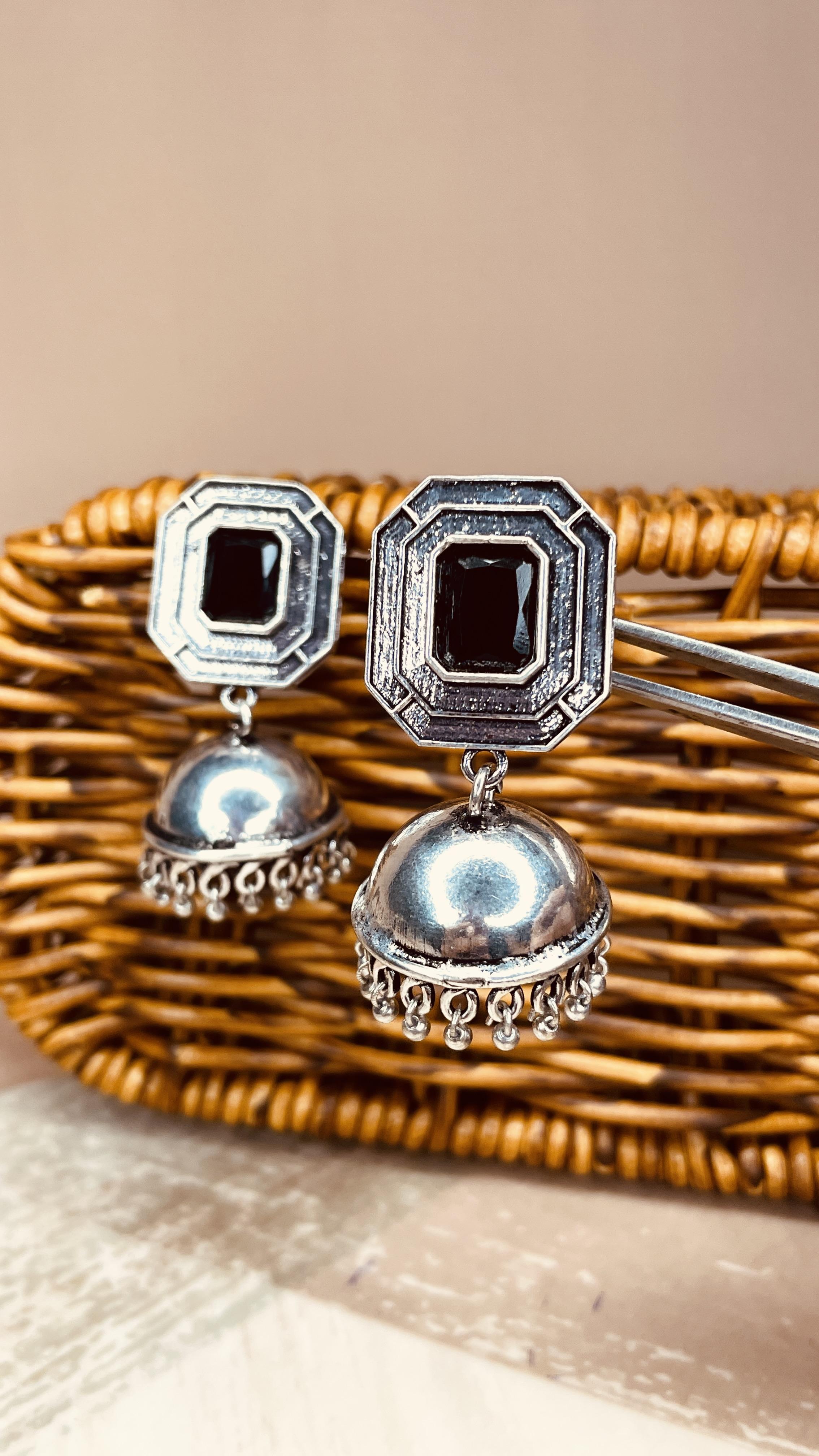 Step into elegance with the Oxidised Square Stud Jhumka Earrings, a fusion of bold vintage aesthetics and graceful charm. Featuring an antique silver finish with a geometric stud and rich black stone detail, these jhumkas blend regal sophistication with everyday wearability. The dome-shaped jhumka with intricate ghungroo accents adds rhythmic movement and ethnic flair, making it a must-have for festive looks, ethnic styling, or statement casual wear.