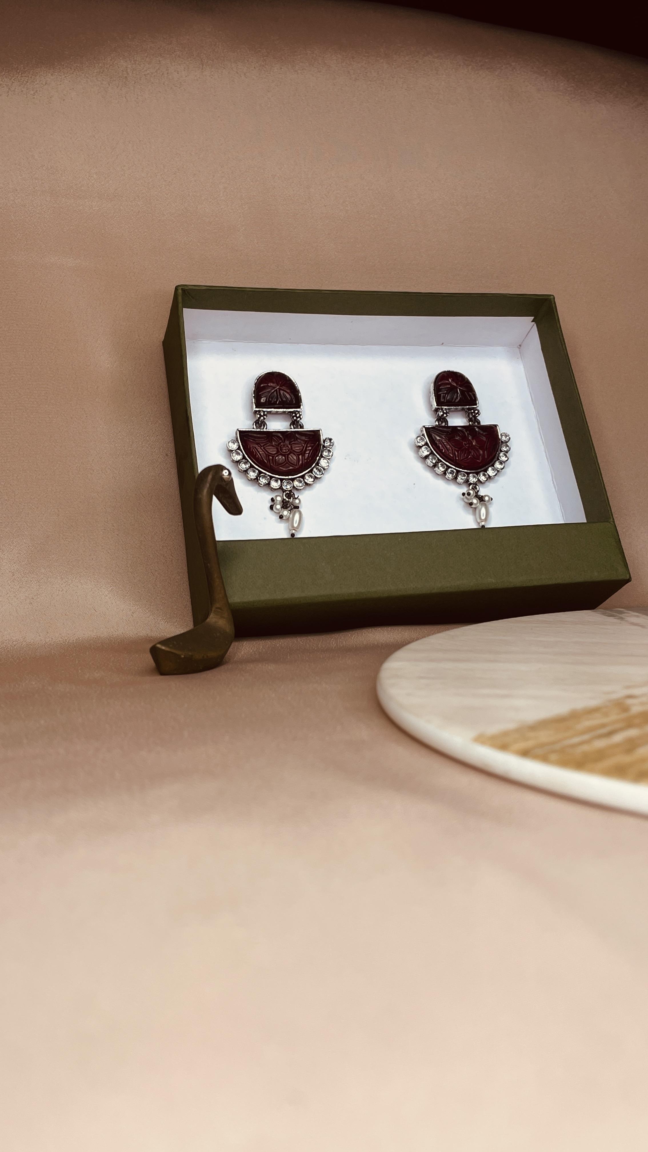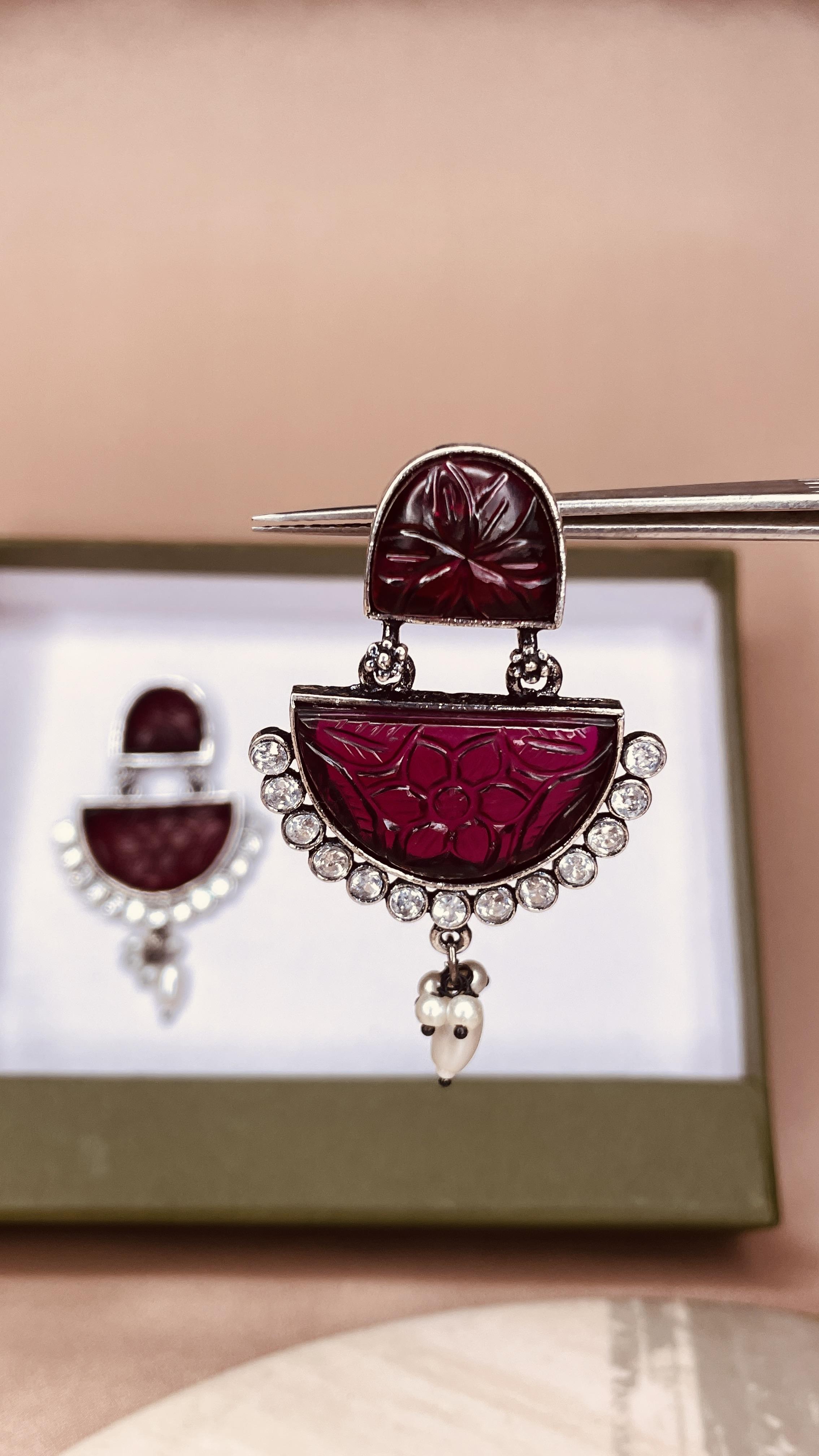 Elevate your ethnic and fusion looks with these intricately crafted oxidised dangler earrings, featuring stunning hand-carved stones set in a high-quality brass base. The unique floral carving and antique oxidised finish exude timeless elegance, while the sparkling stone border and dainty pearl drop add a graceful charm. Perfect for festive wear, weddings, or a stylish everyday statement, these earrings bring a blend of traditional artistry and contemporary design.
