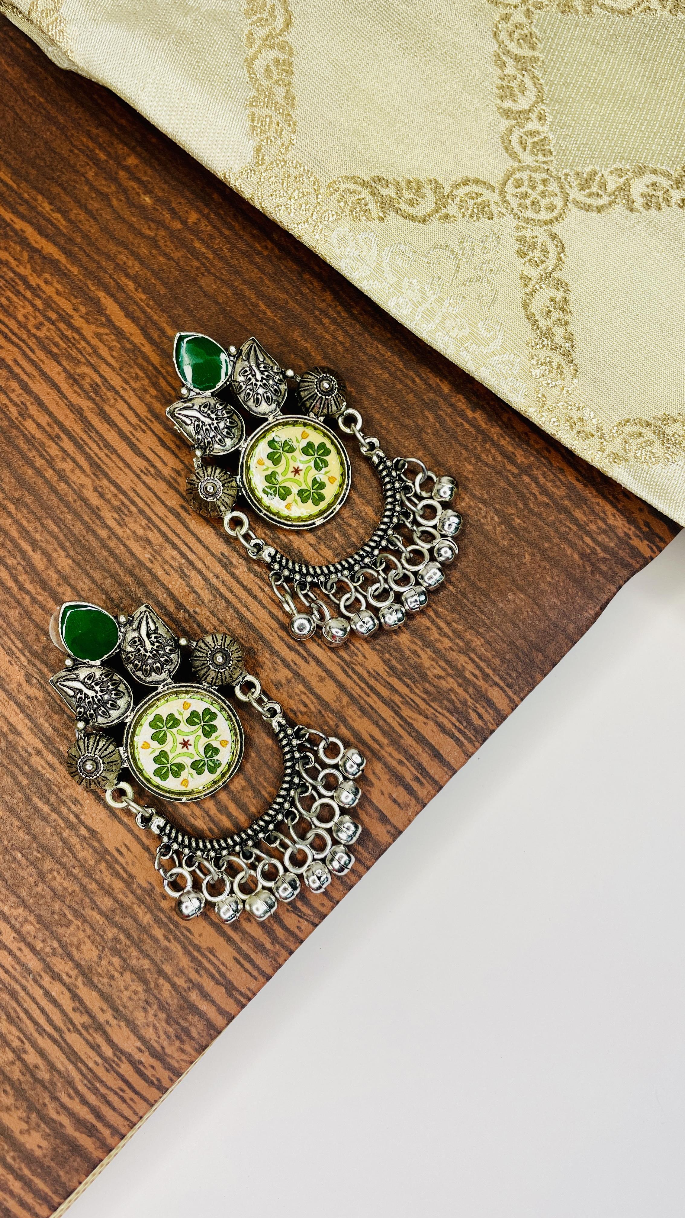 Make an unforgettable style statement with our Charvi Oxidised Dangler Earrings. Crafted in dark-polish oxidised finish, these earrings beautifully blend traditional artistry with modern flair. The intricate floral motif paired with green stone detailing and tiny ghungroo drops adds an ethnic charm that complements both festive and everyday looks. Perfect for sarees, kurtas, or fusion wear, Charvi brings out your inner elegance effortlessly.