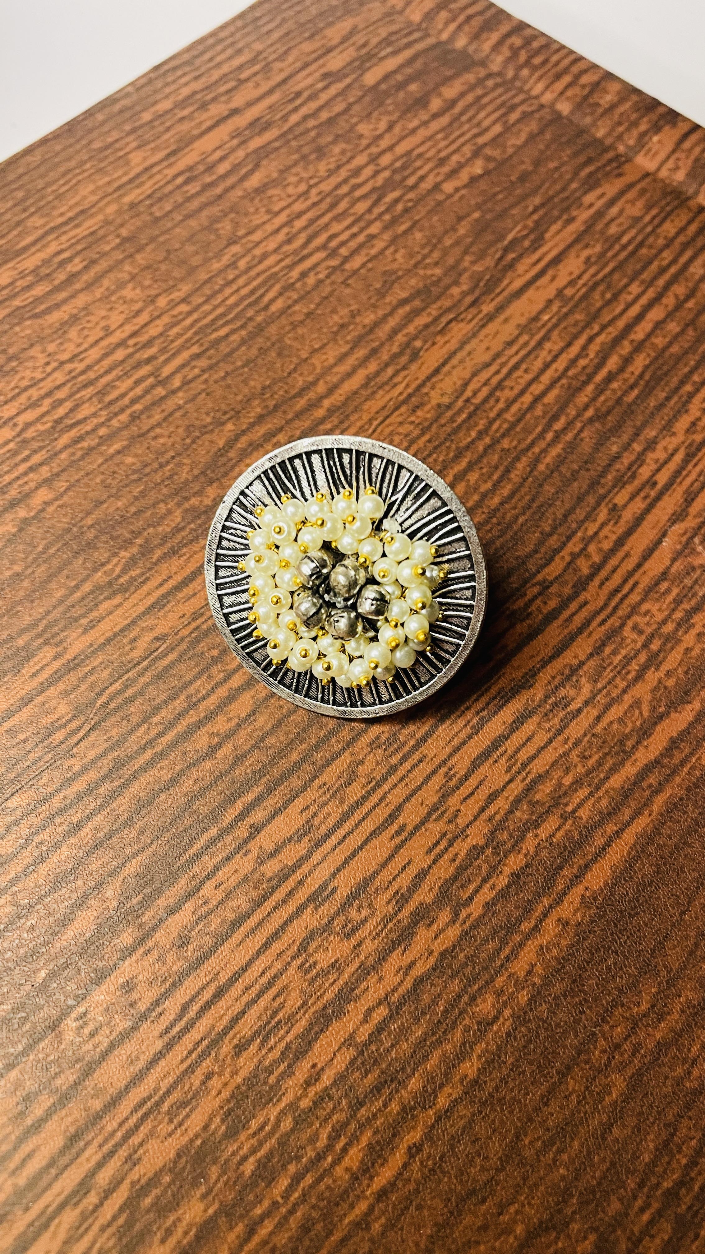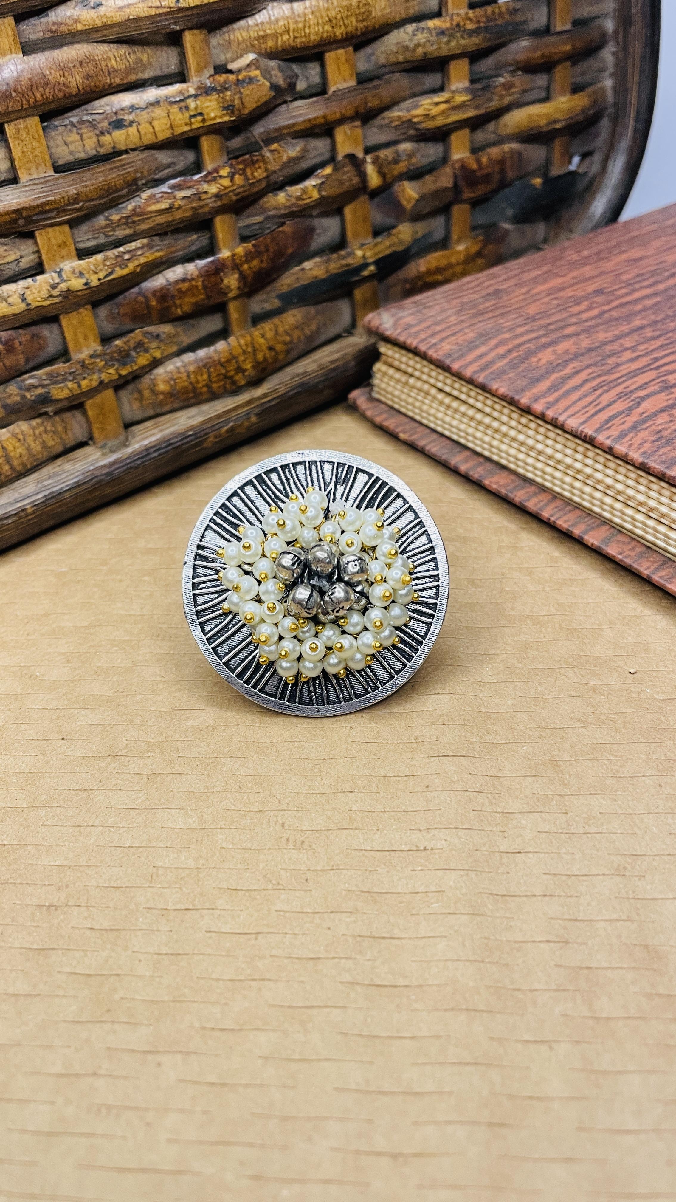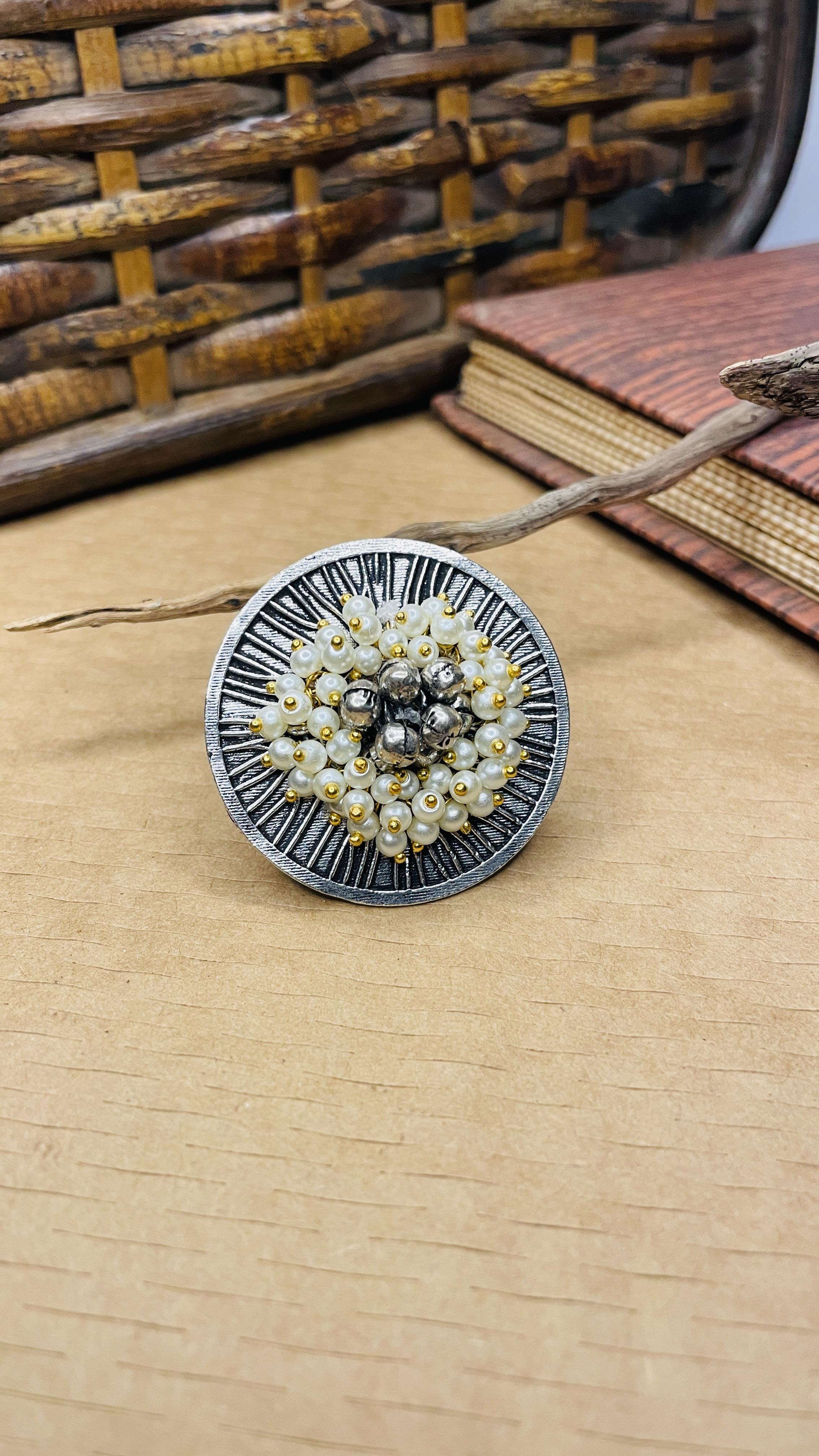 Celebrate tradition with a touch of modern artistry in the Gulband Pearl Cluster Oxidised Ring. Handcrafted from brass and adorned with a beautiful arrangement of white and gold-tone micro pearls, this circular ring blooms with elegance. The oxidised silver backdrop creates a striking contrast, enhancing the intricate floral design at the center.