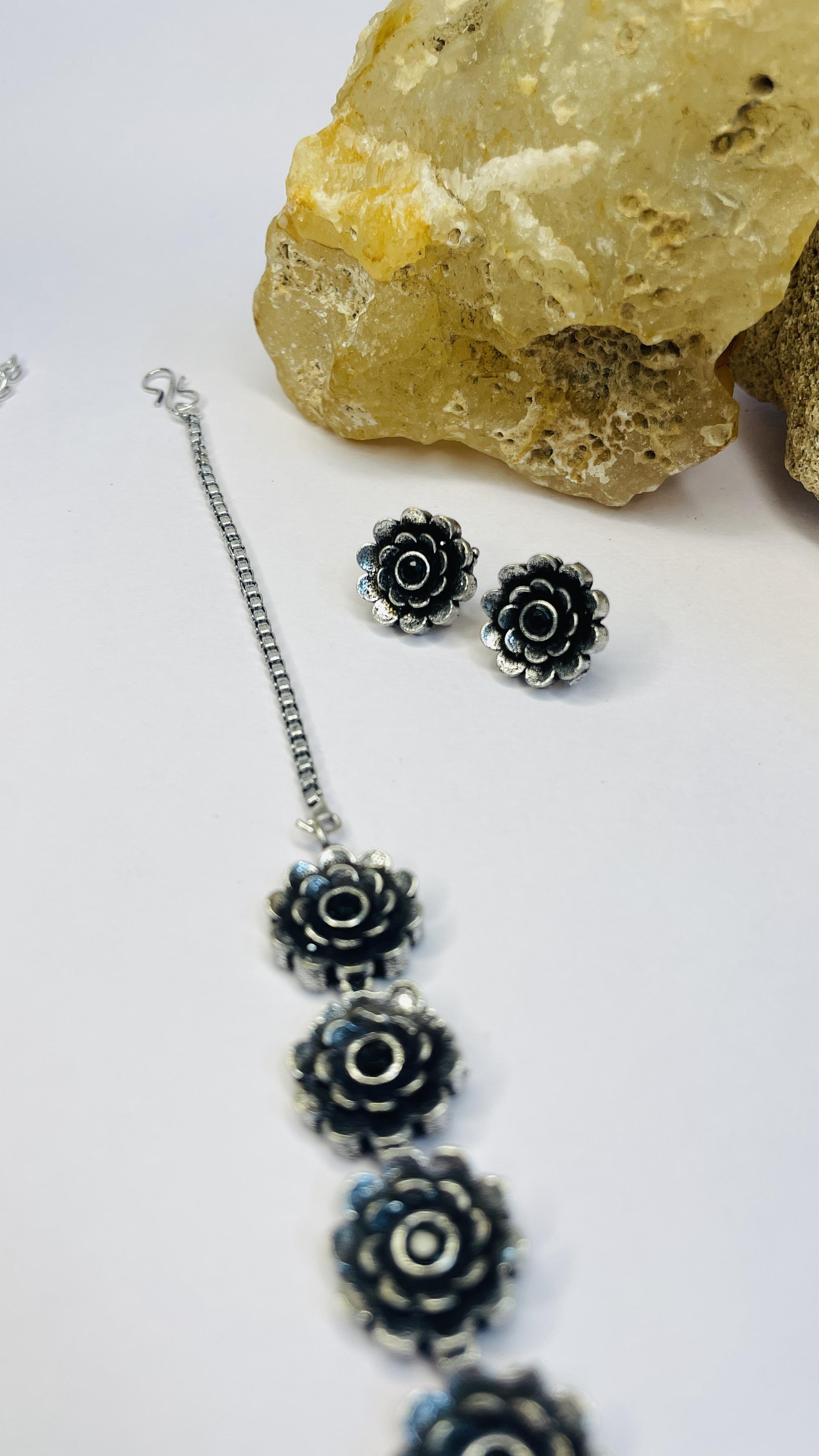 Embrace timeless elegance with the Kamalika Oxidised Floral Charm Necklace Set. Featuring a harmonious row of intricate lotus-inspired floral motifs in antique silver finish, this set captures the essence of traditional beauty with a modern edge. Paired with classic matching studs, this lightweight yet impactful necklace is perfect for women who love adding a refined touch to their ethnic or fusion outfits.
