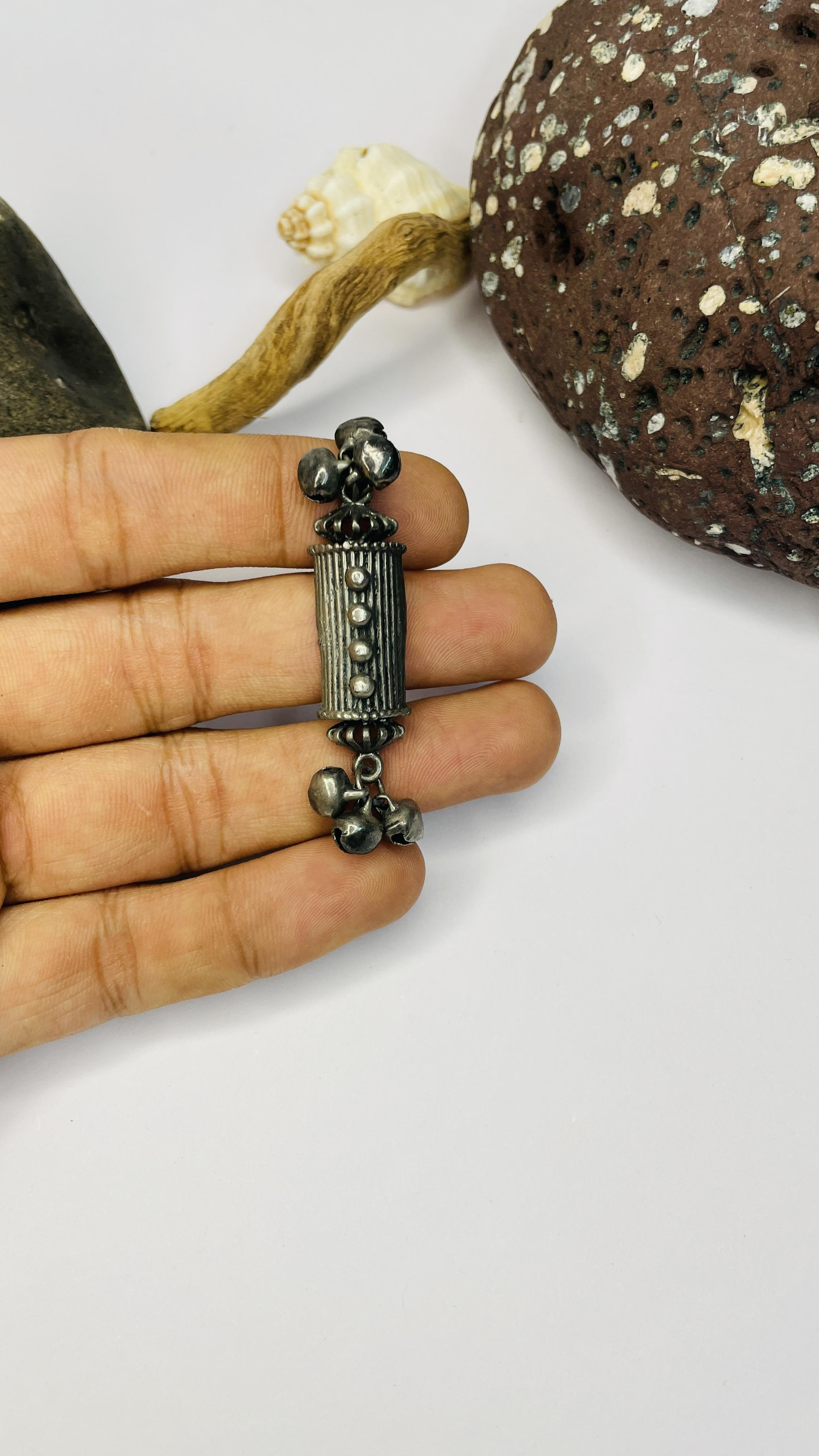Infuse your ensemble with rustic rhythm and heritage through the Naad Baja Oxidised Ghungroo Ring. This bold, cylindrical design features intricate line detailing and is adorned with antique-finished ghungroos that sway with every move, adding a musical essence to your ethnic charm. Crafted on a sturdy brass base and finished with oxidised silver plating, it’s a unique piece that celebrates folk and tribal aesthetics with contemporary grace.