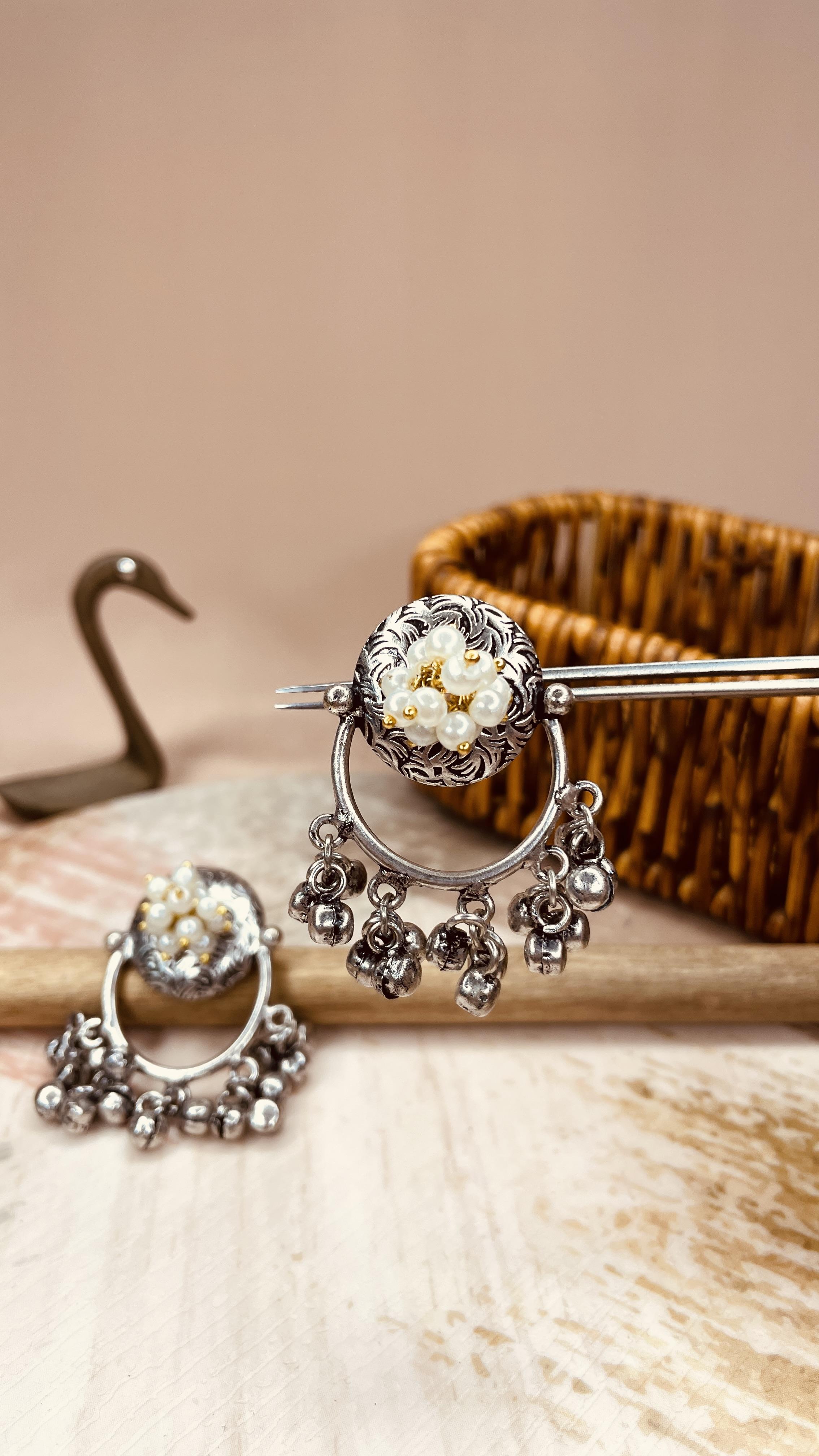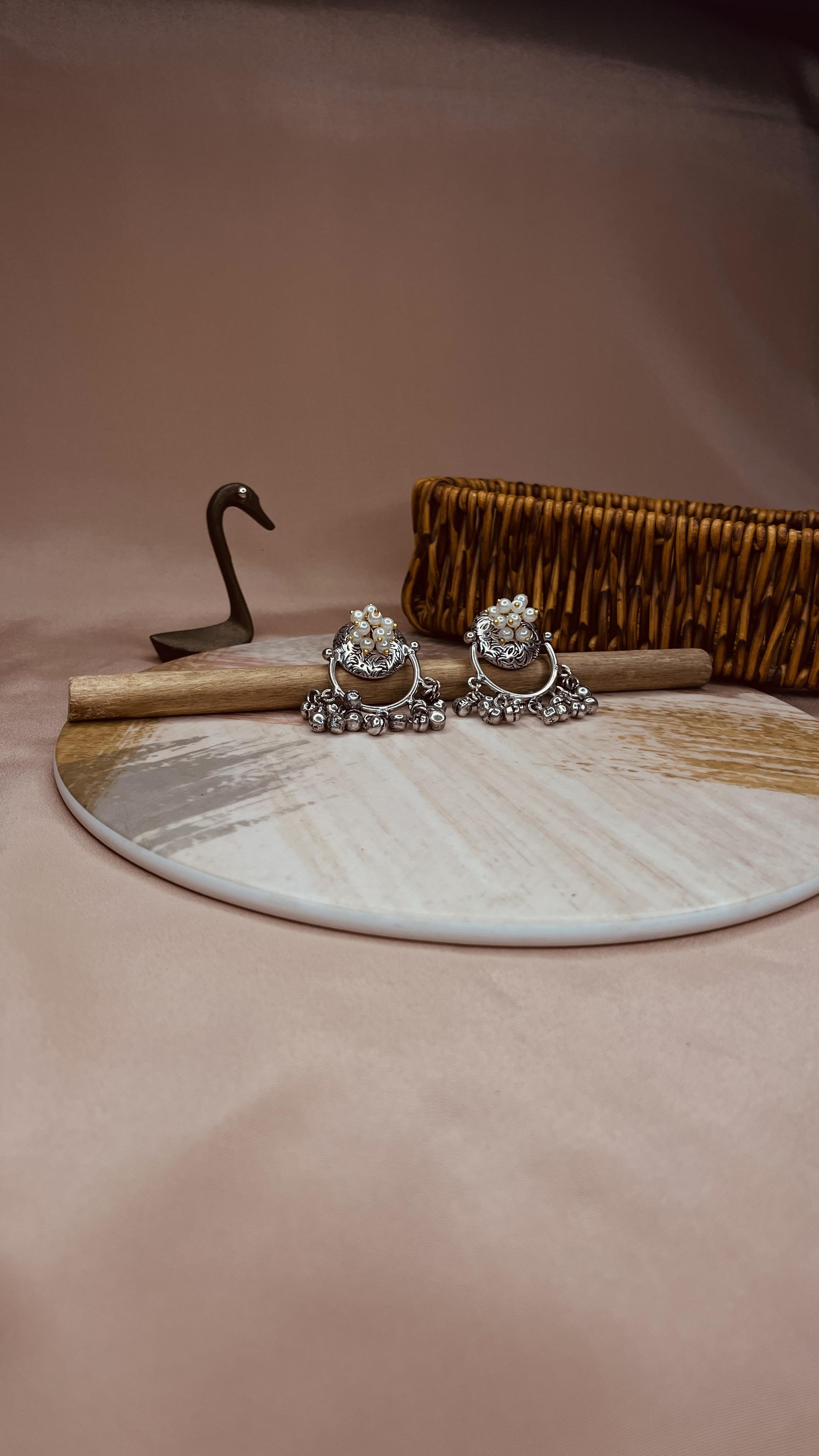 Turn heads with these handcrafted Oxidised Pearl & Ghungroo Dangler Earrings – a perfect fusion of traditional charm and boho elegance. Designed in a classic round silhouette, these earrings feature intricately carved floral patterns on an oxidised brass base, beautifully adorned with clustered faux pearls and jingling ghungroo beads. Lightweight yet statement-making, these danglers are perfect for festive celebrations, ethnic events, and everyday style with an artistic twist.