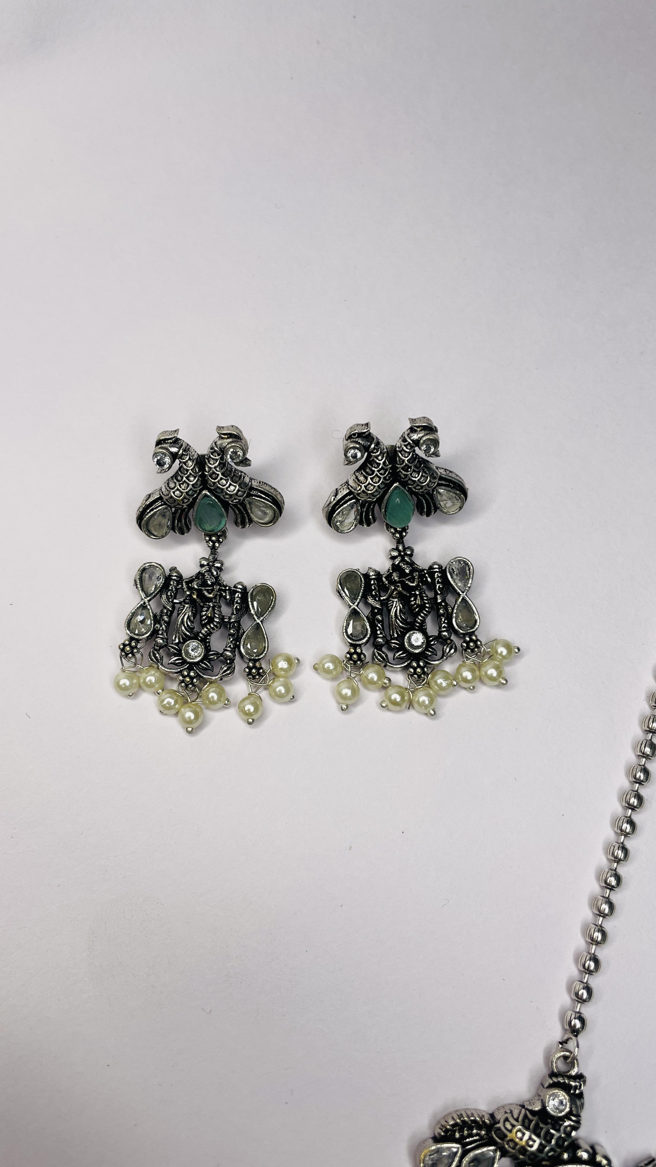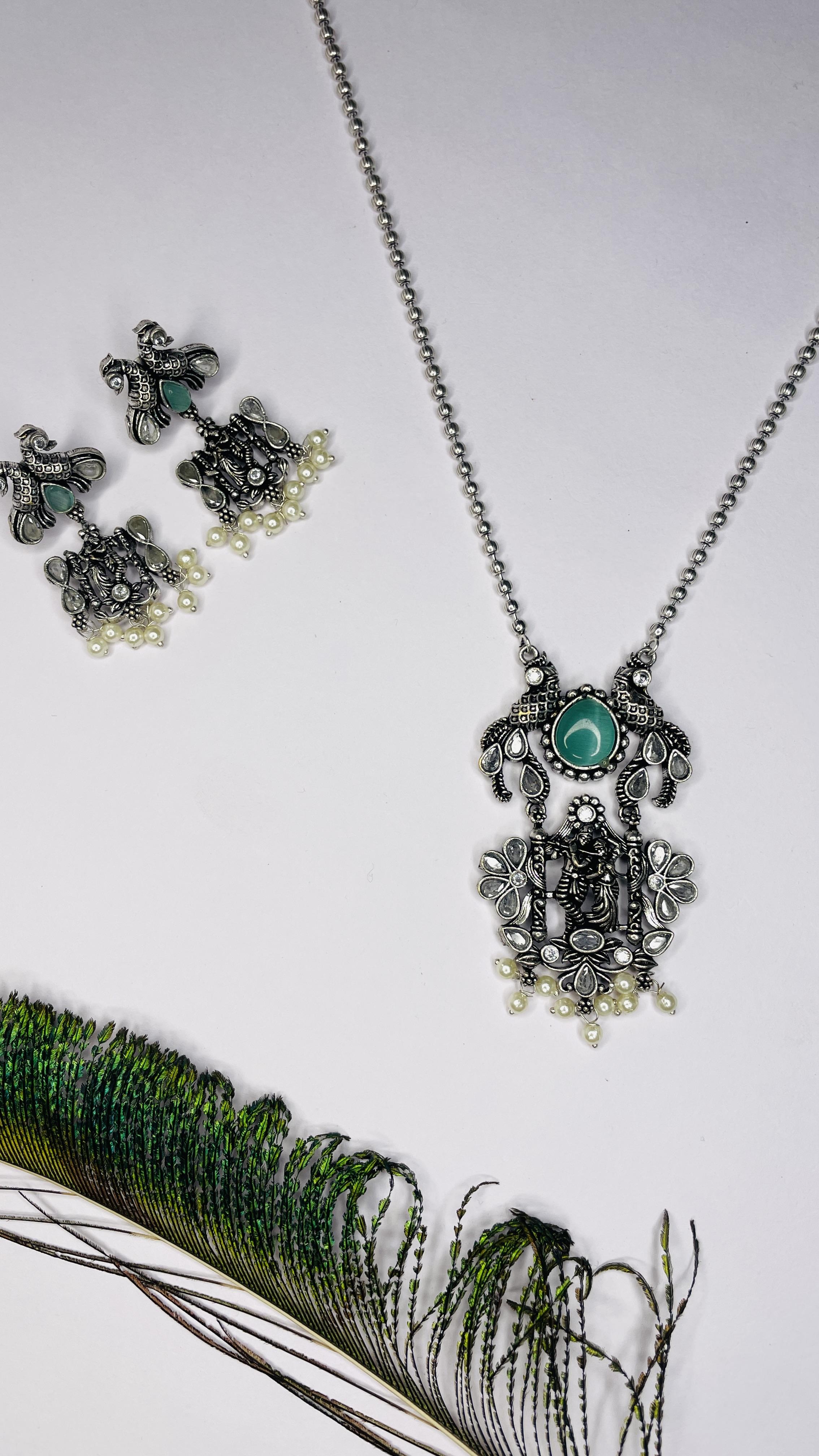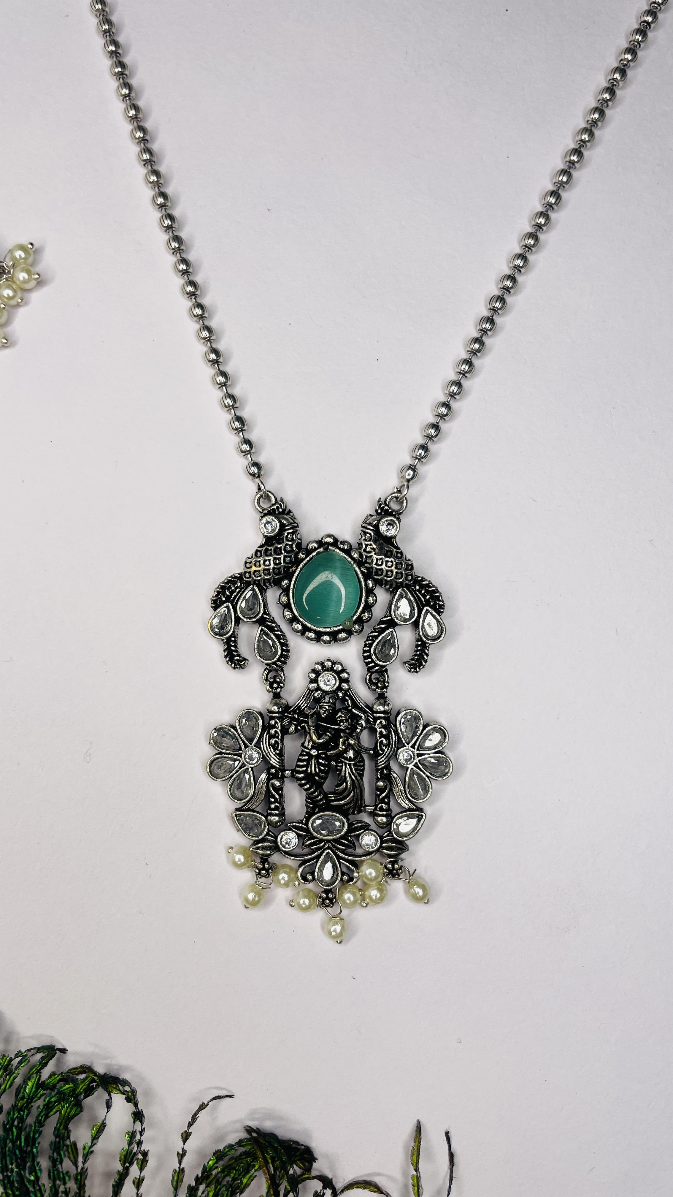 Celebrate eternal love and devotion with the Prem Raas Oxidised Radha Krishna Necklace Set. Handcrafted in antique-finish oxidised silver, this elegant piece features a beautifully detailed Radha Krishna pendant adorned with twin peacocks, floral motifs, and a striking green stone centerpiece. Finished with delicate pearl hangings and paired with matching statement earrings, this set exudes spiritual charm and ethnic elegance.