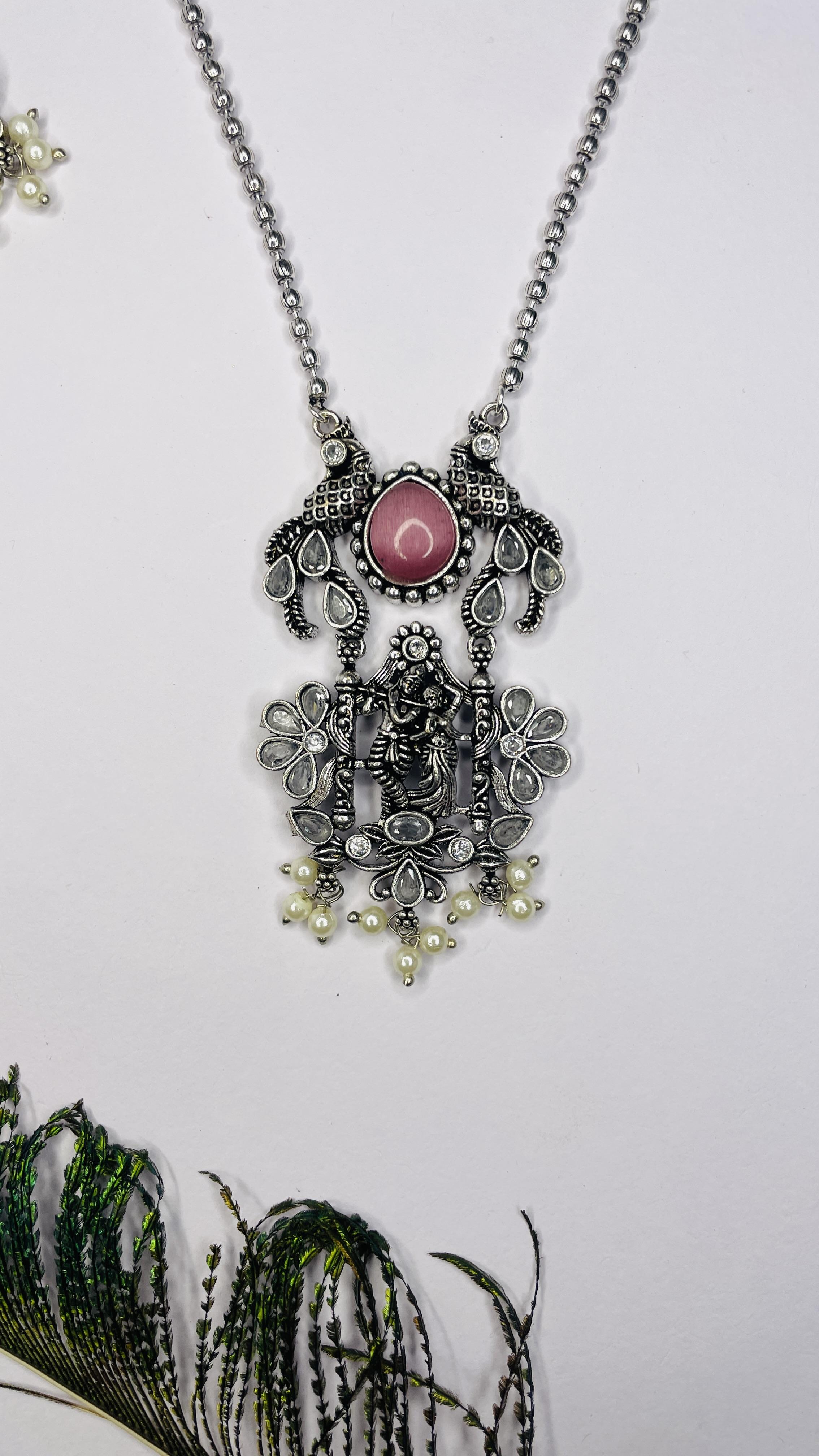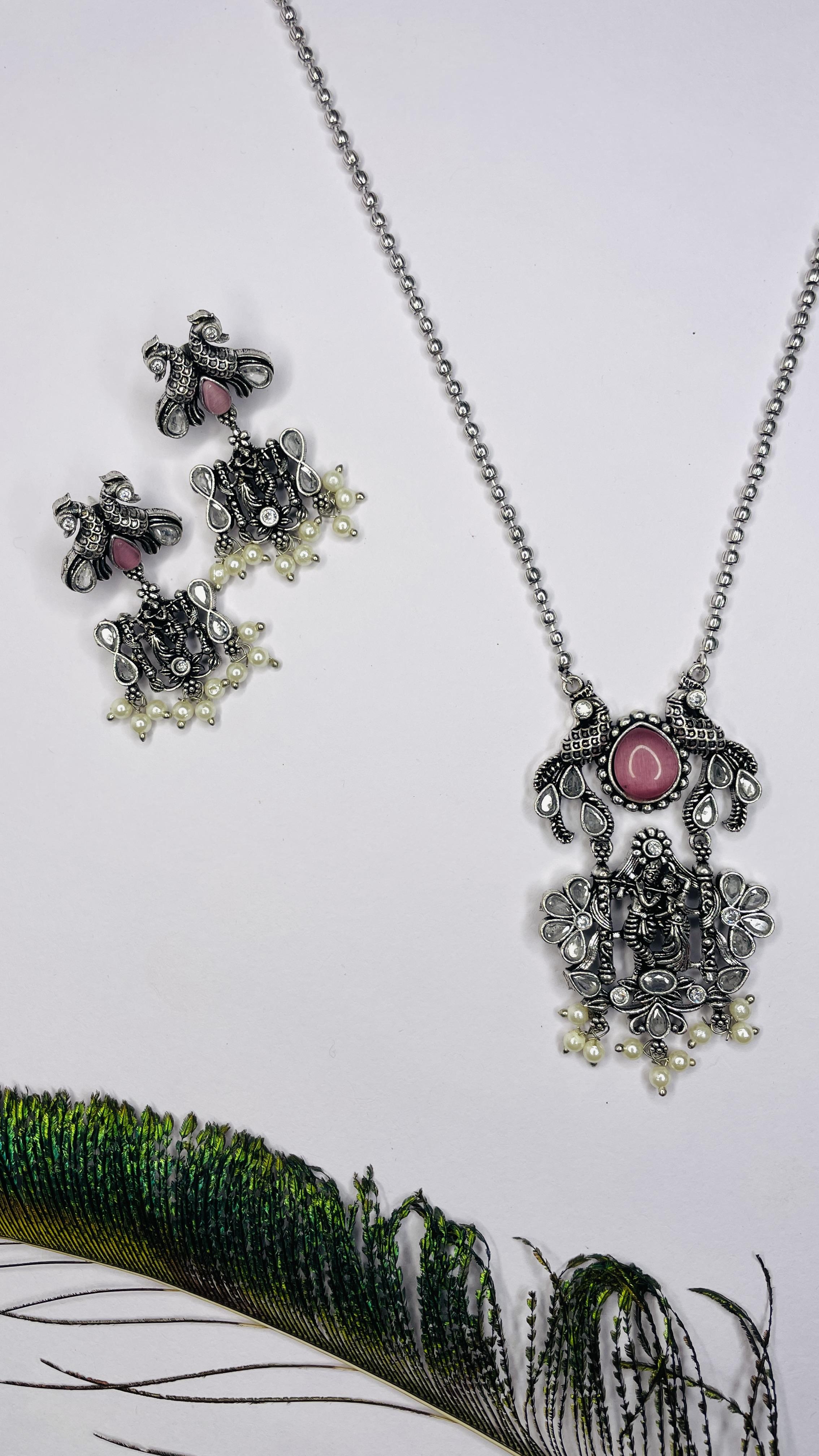 Celebrate eternal love and devotion with the Prem Raas Oxidised Radha Krishna Necklace Set. Handcrafted in antique-finish oxidised silver, this elegant piece features a beautifully detailed Radha Krishna pendant adorned with twin peacocks, floral motifs, and a striking green stone centerpiece. Finished with delicate pearl hangings and paired with matching statement earrings, this set exudes spiritual charm and ethnic elegance.