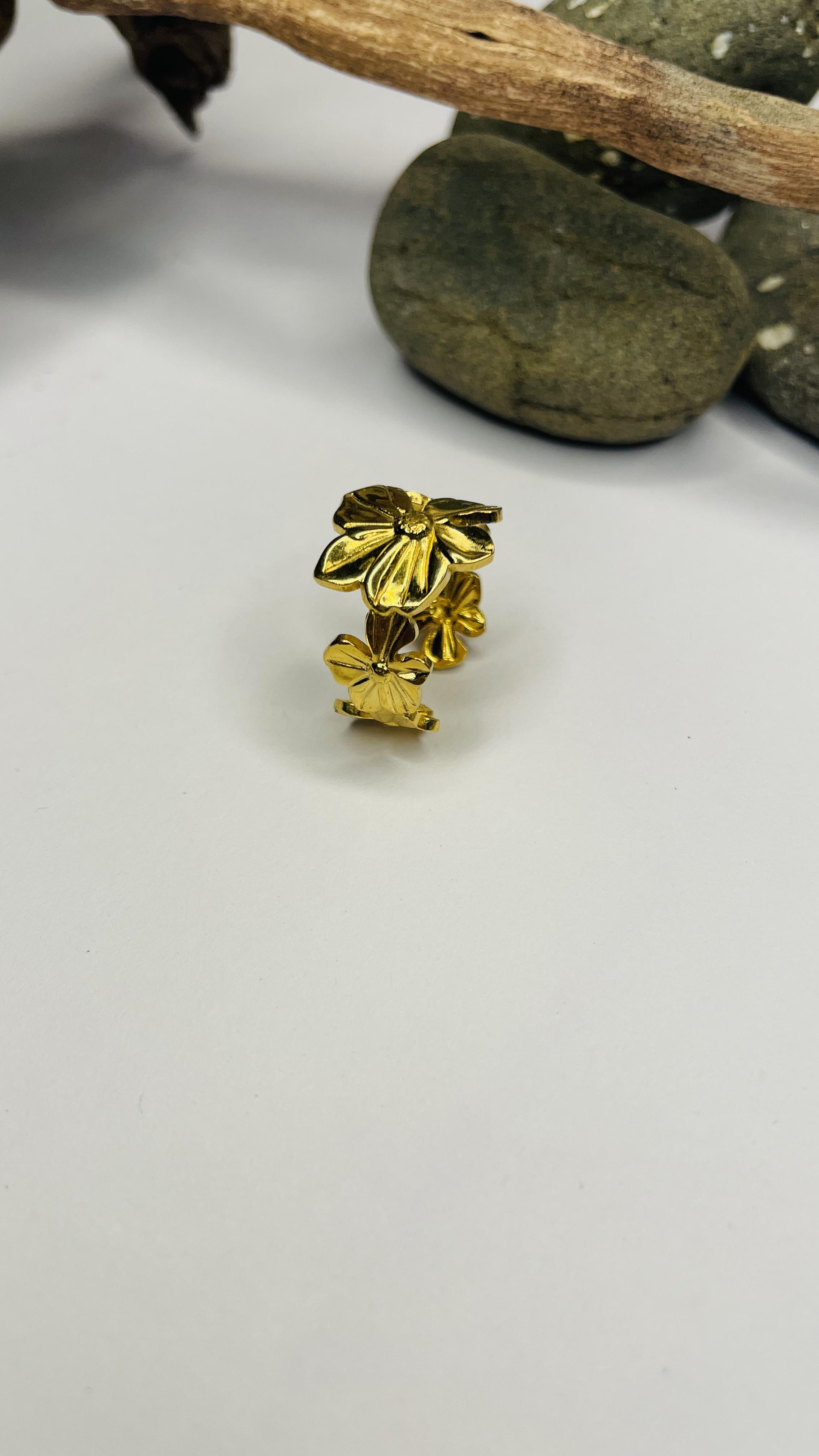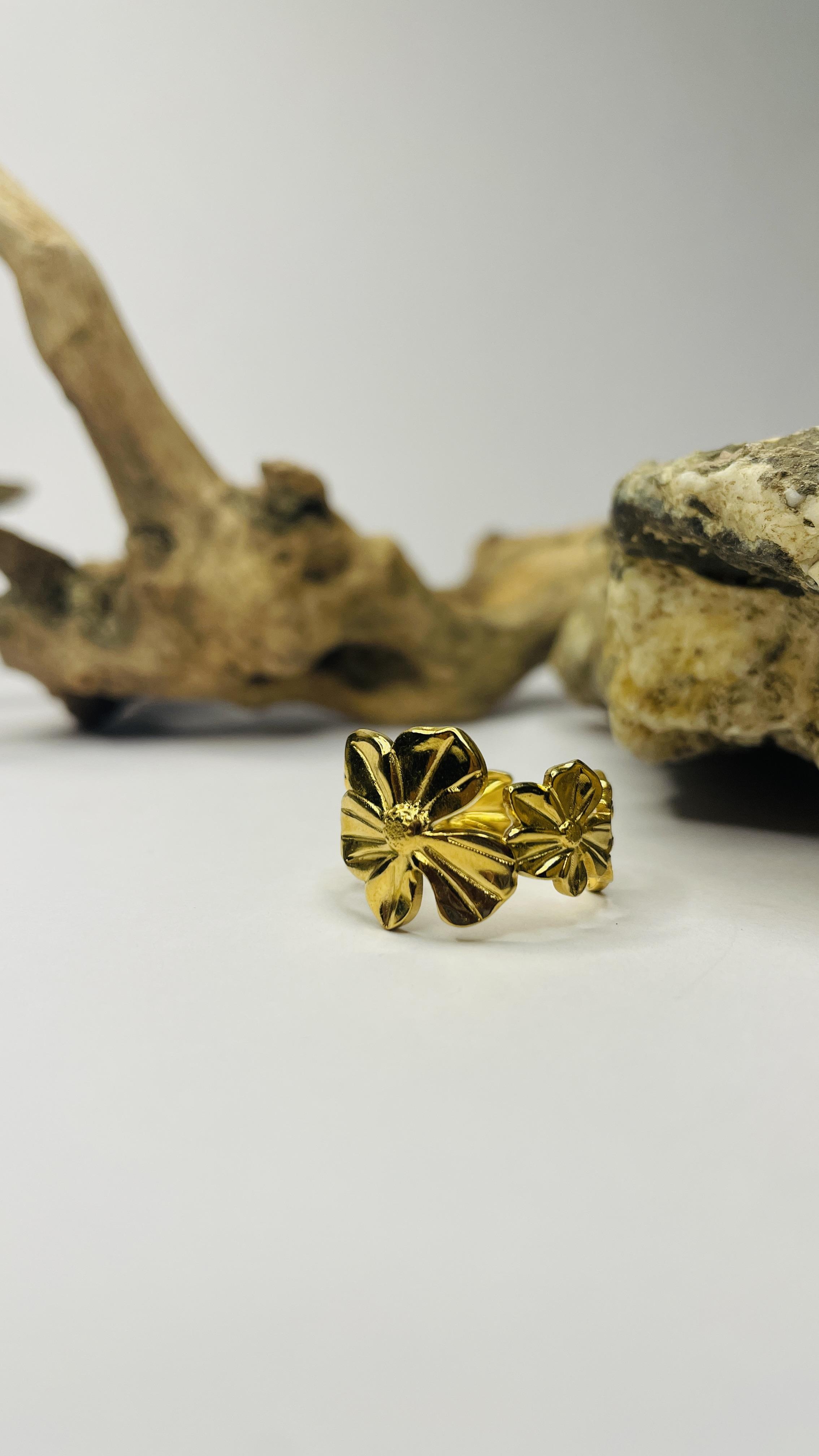 Add a dash of floral charm to your everyday ensemble with the Pushpika Gold Bloom Anti-Tarnish Ring. Featuring twin blooming flowers in a lustrous gold-tone finish, this ring is a beautiful blend of femininity and modern elegance. Crafted with anti-tarnish technology on a premium Stainless Steel, it ensures lasting shine and wear without fading or rusting.
