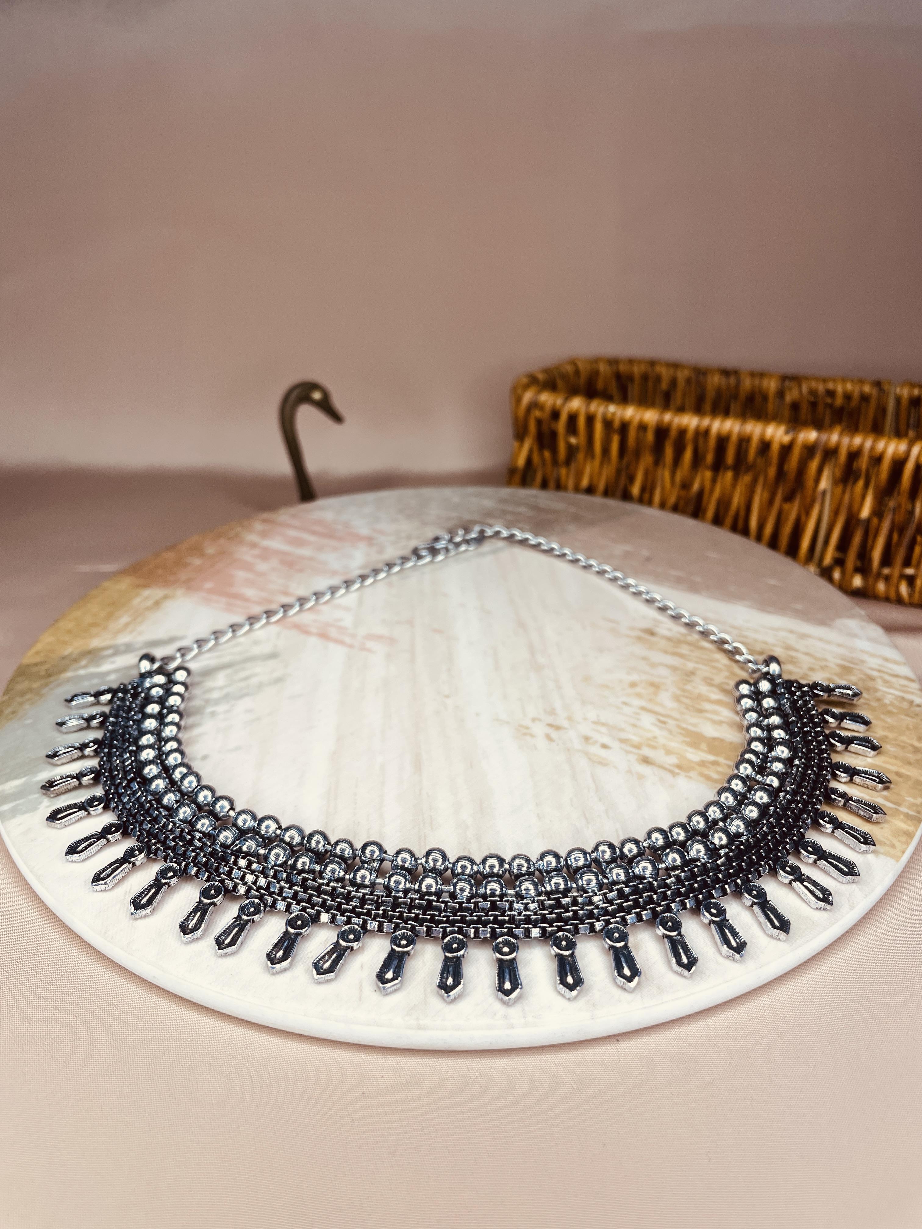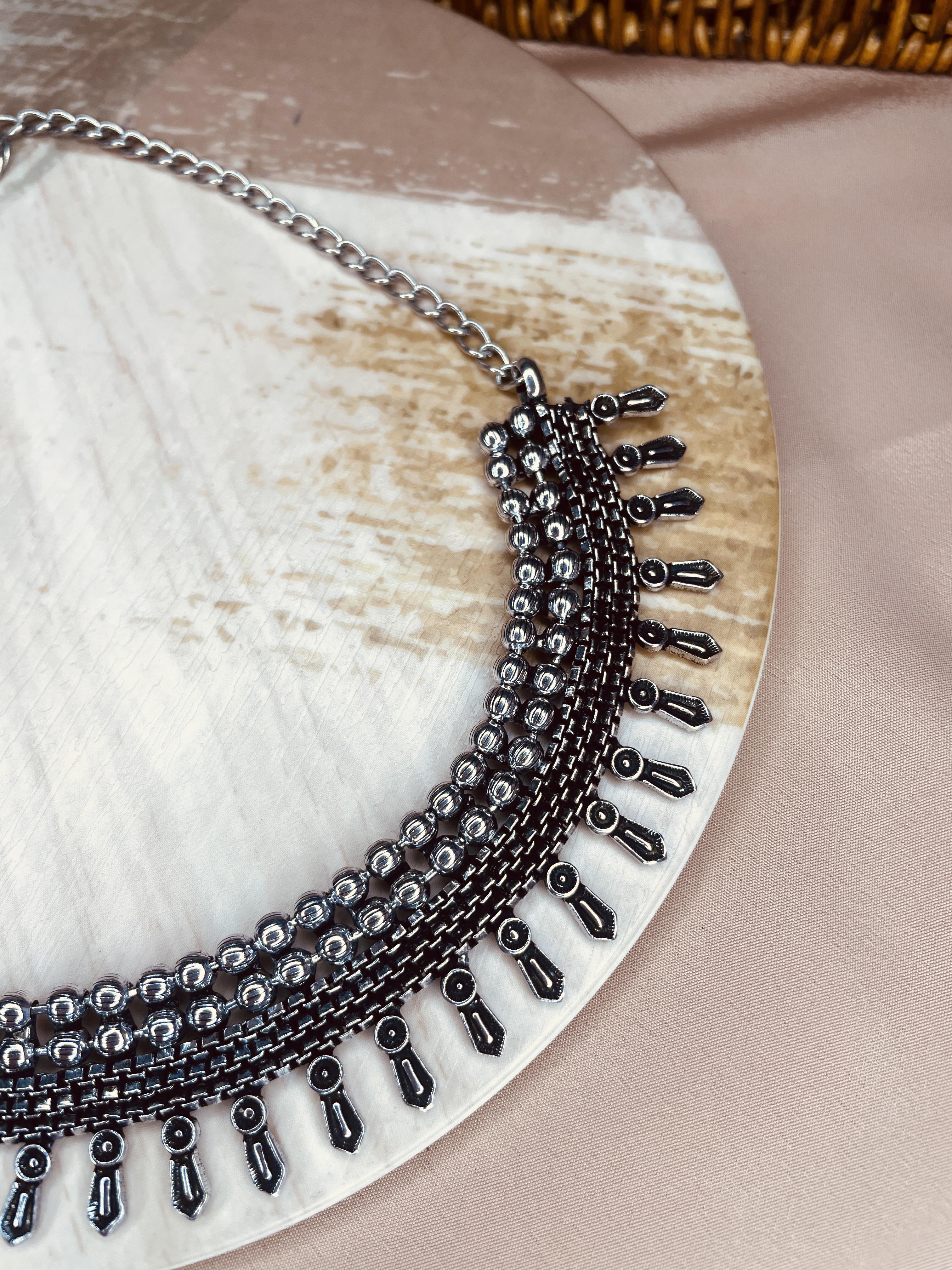 Elevate your ethnic and fusion look with this beautifully crafted oxidised silver choker. Designed with intricate detailing and bold beads, this statement piece hugs your neckline perfectly, adding a touch of vintage elegance to any outfit. Ideal for festive occasions, weddings, or even a stylish everyday look — this choker is a must-have in your jewellery collection.