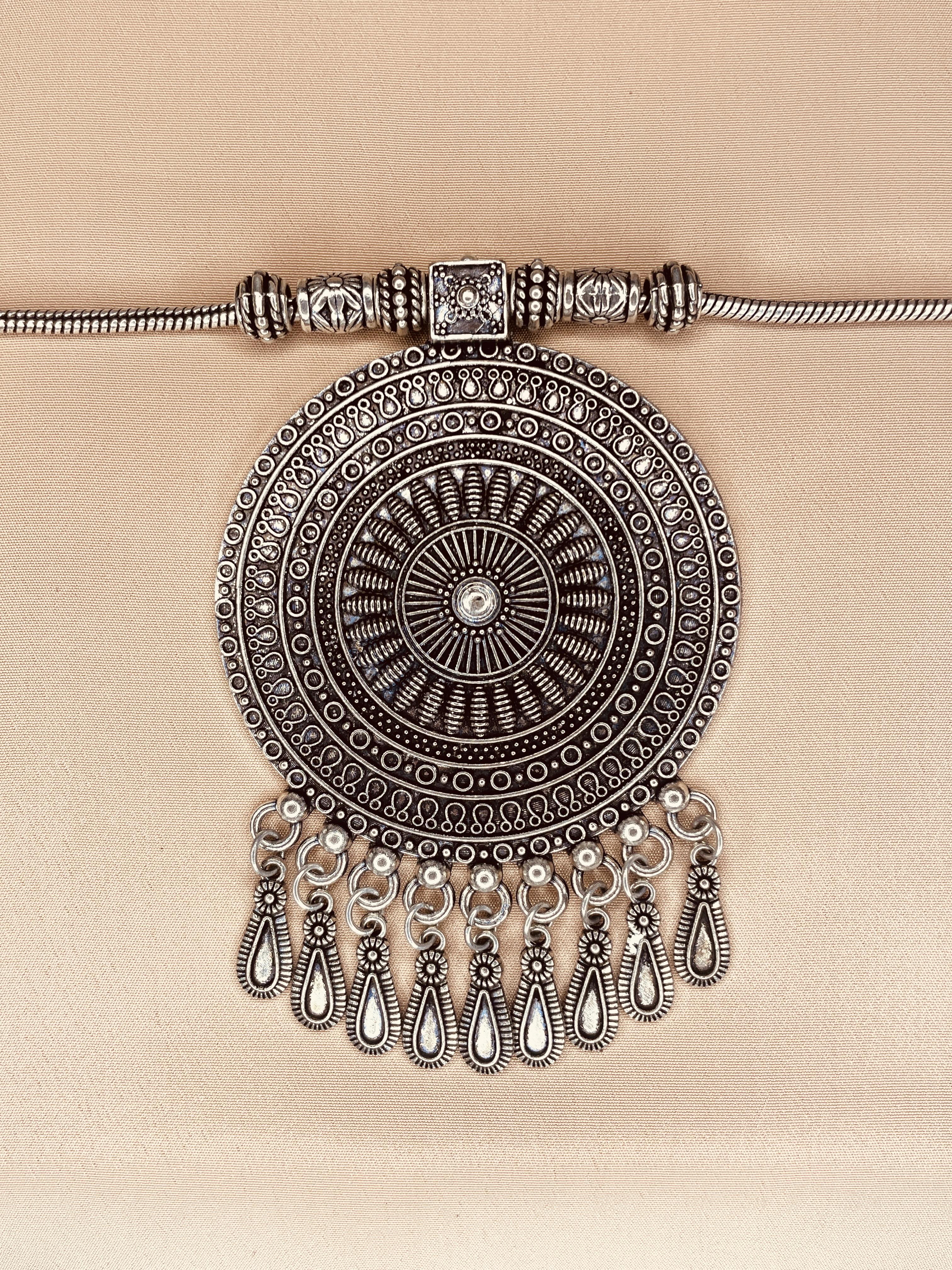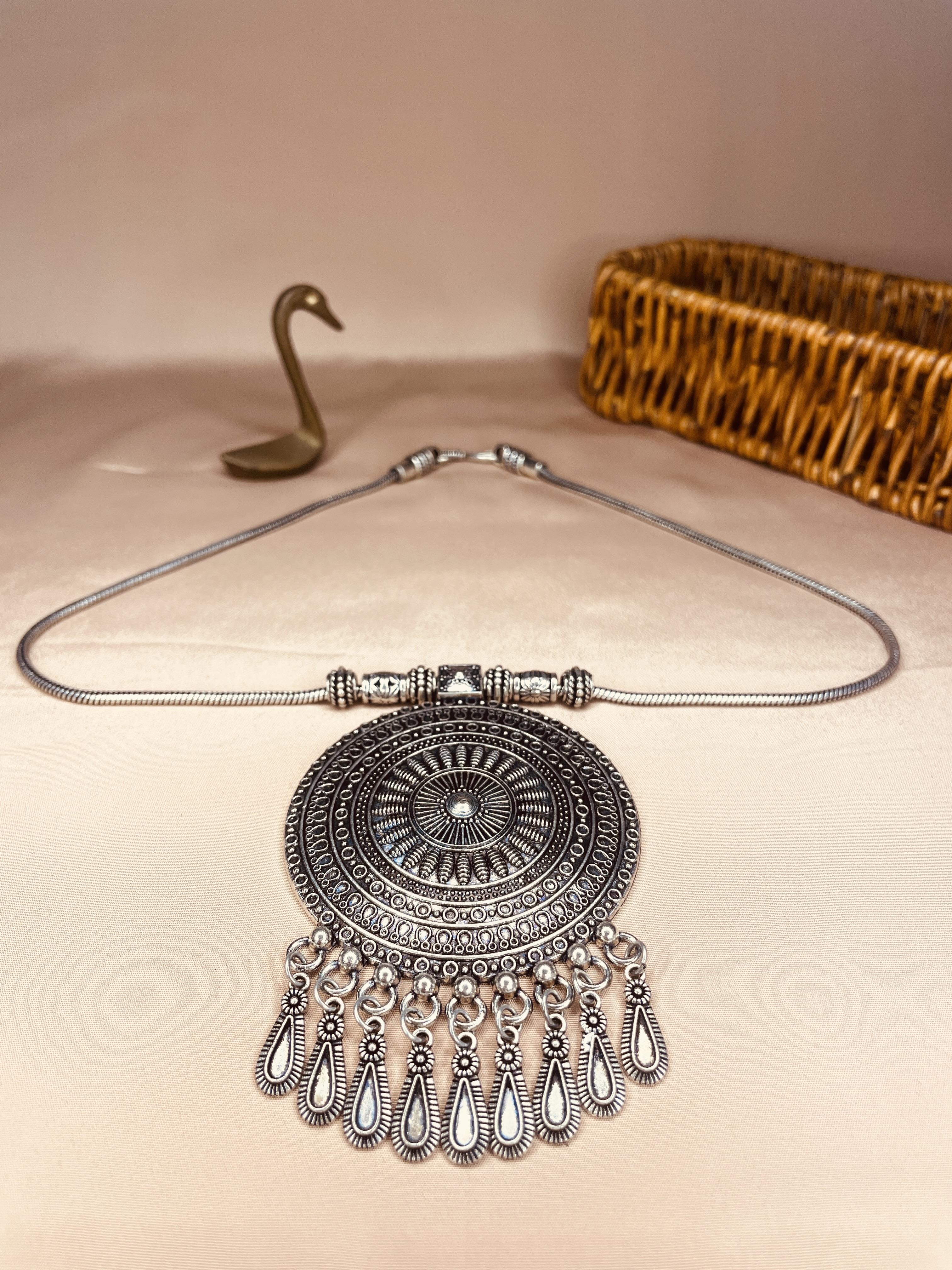 Make a bold style statement with our Sun Shield Oxidised Chain Pendant Necklace. Crafted with intricate tribal-inspired detailing, this antique silver-tone neckpiece adds instant charm to ethnic and Indo-western outfits. The large circular pendant with engraved patterns and drop detailing makes it a perfect accessory for festive occasions, cultural events, or fashion-forward casual wear.