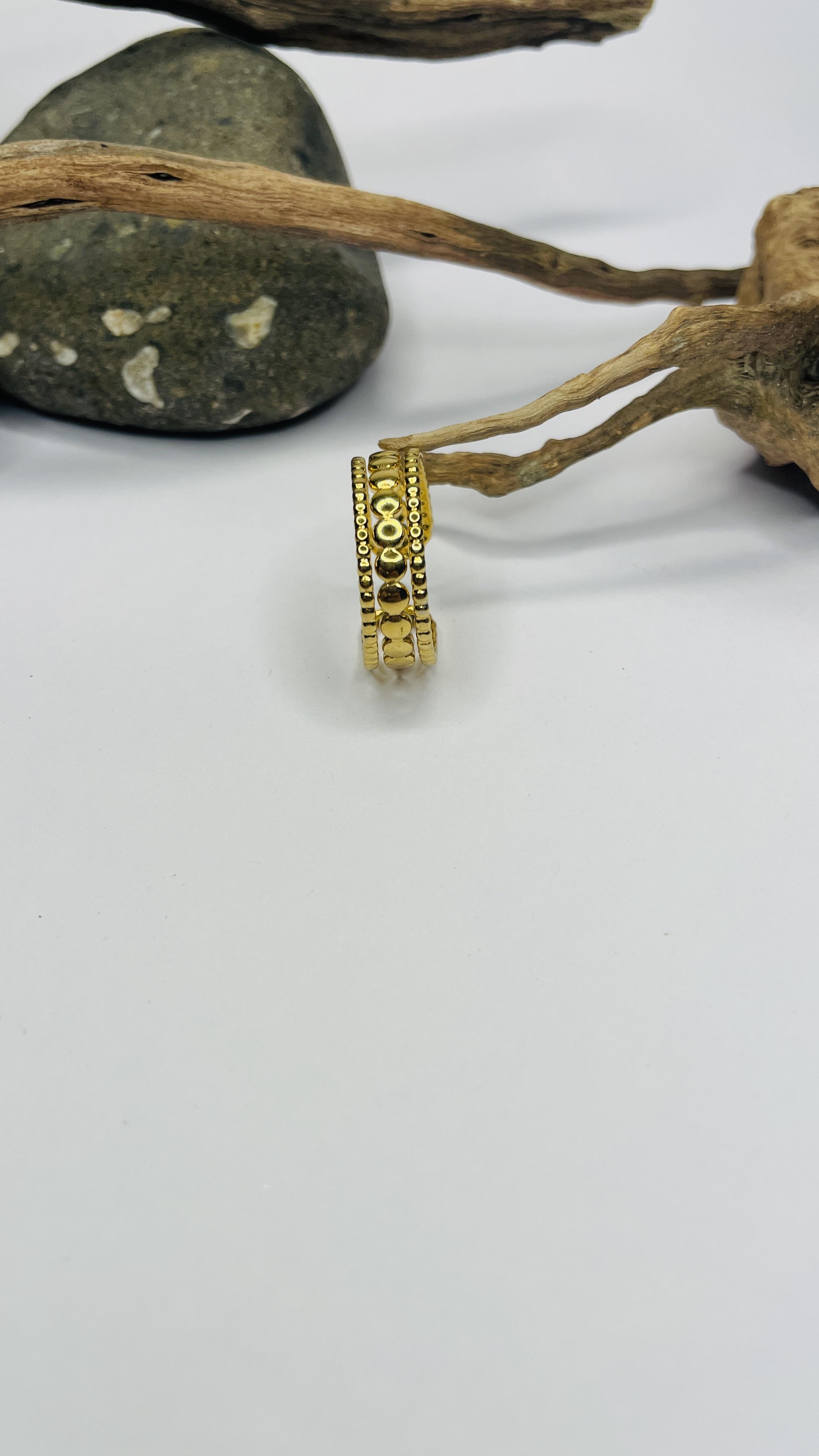 Bring a touch of everyday royalty to your look with the Svarna Glow Anti-Tarnish Adjustable Ring. Designed in radiant gold-tone finish and detailed with beaded dual borders and bold central discs, this open-band ring combines minimalist charm with timeless luxury. Crafted with premium anti-tarnish coating on a durable base, this ring is perfect for long-lasting shine — no fading, no rusting, just effortless elegance.