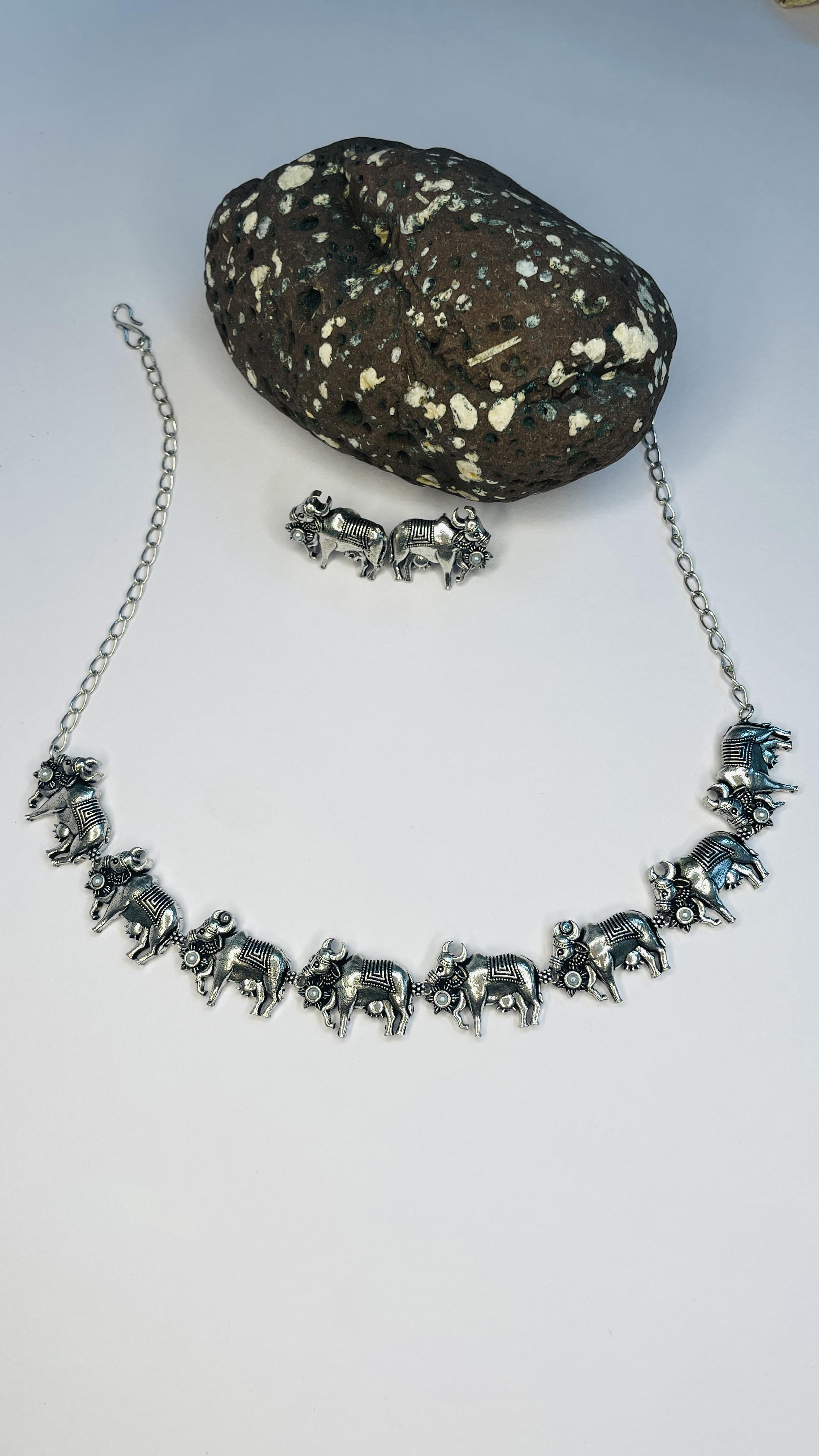 Unique oxidised silver necklace set with carved cow motifs