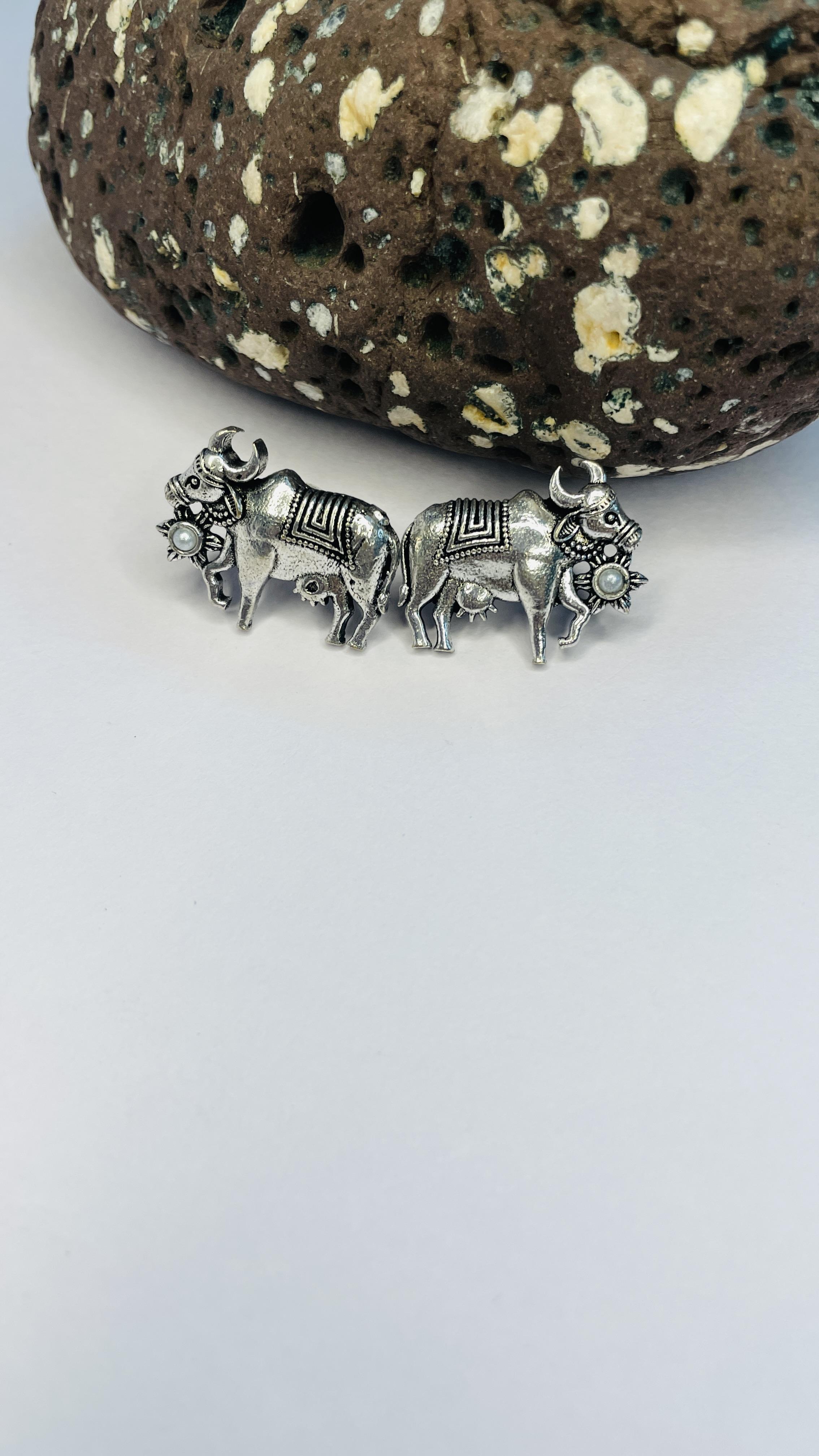 Celebrate rustic charm and cultural symbolism with the Vrisha Heritage Oxidised Cow Motif Necklace Set. Handcrafted with a series of detailed bull figurines in antique silver finish, this statement necklace captures the essence of rural artistry and timeless tribal elegance. Paired with matching earrings, this set is ideal for fashion-forward women who love heritage-inspired jewellery with a bold edge.